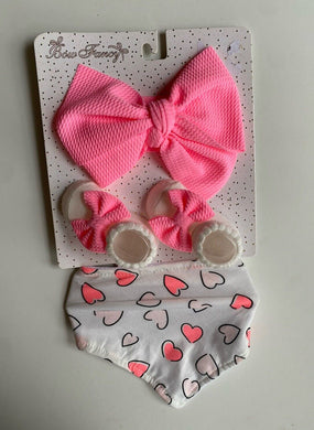 Bow Fancy baby girl size approx 0-6 months neon pink socks headband bib set BNWT