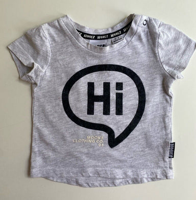 Mooks baby size 0-3 months grey short sleeve t-shirt speech bubble, VGUC