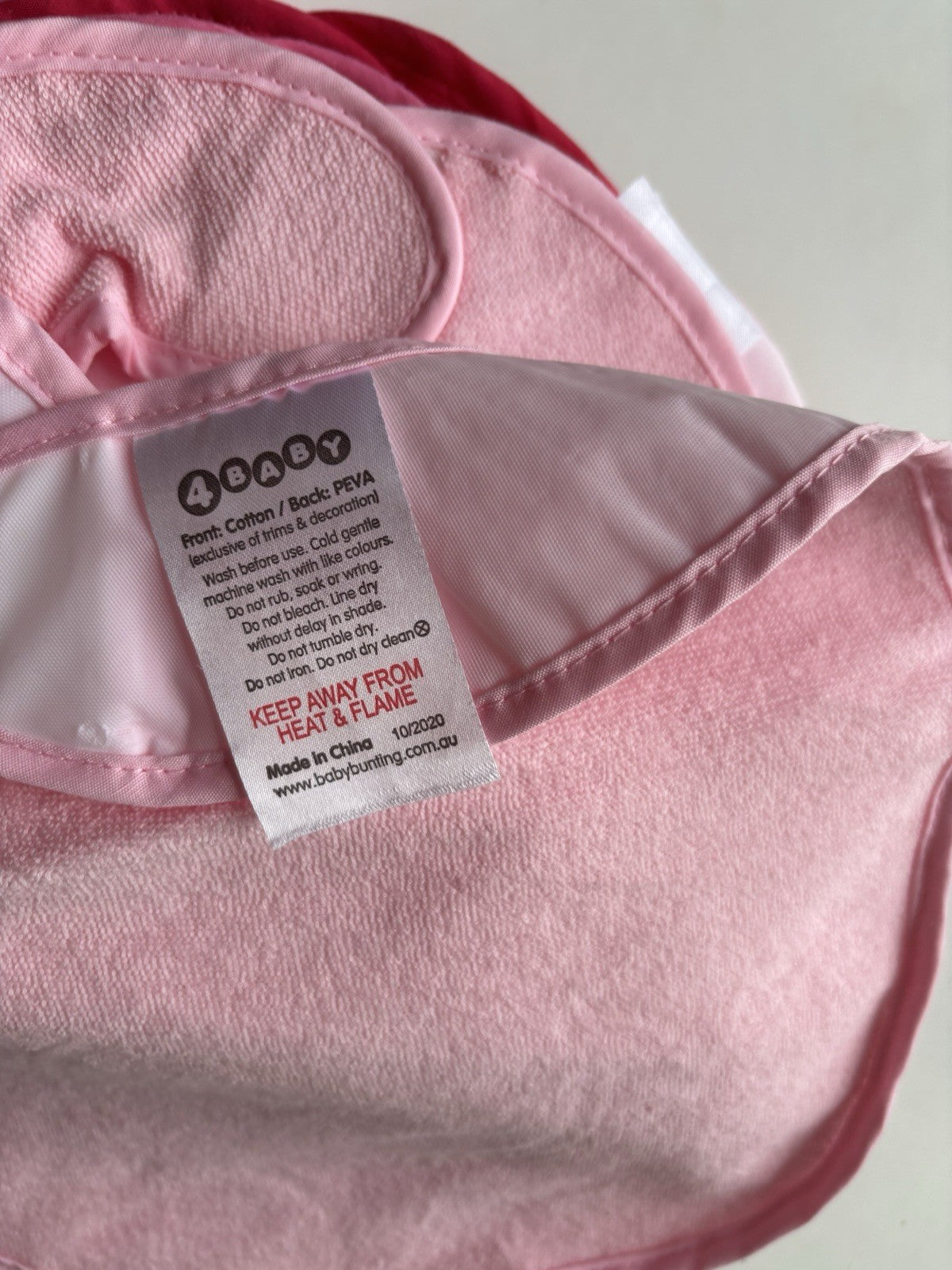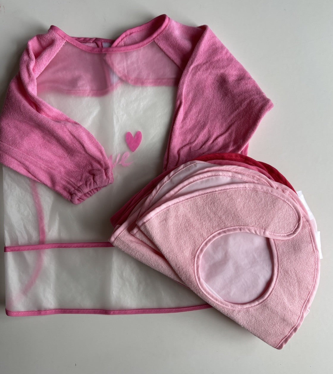 4Baby baby girl x9 pink bibs x1 smock bundle one size, VGUC