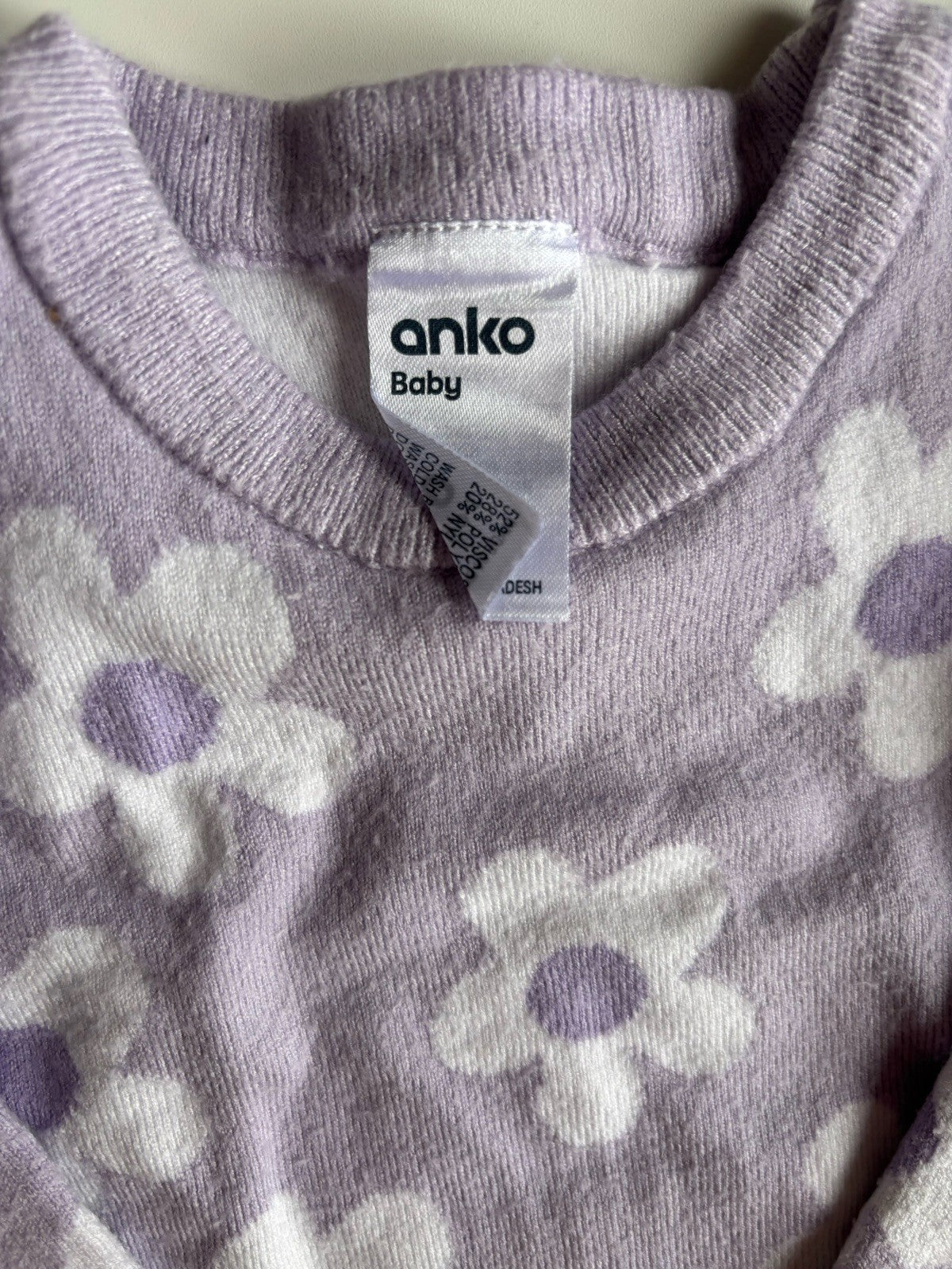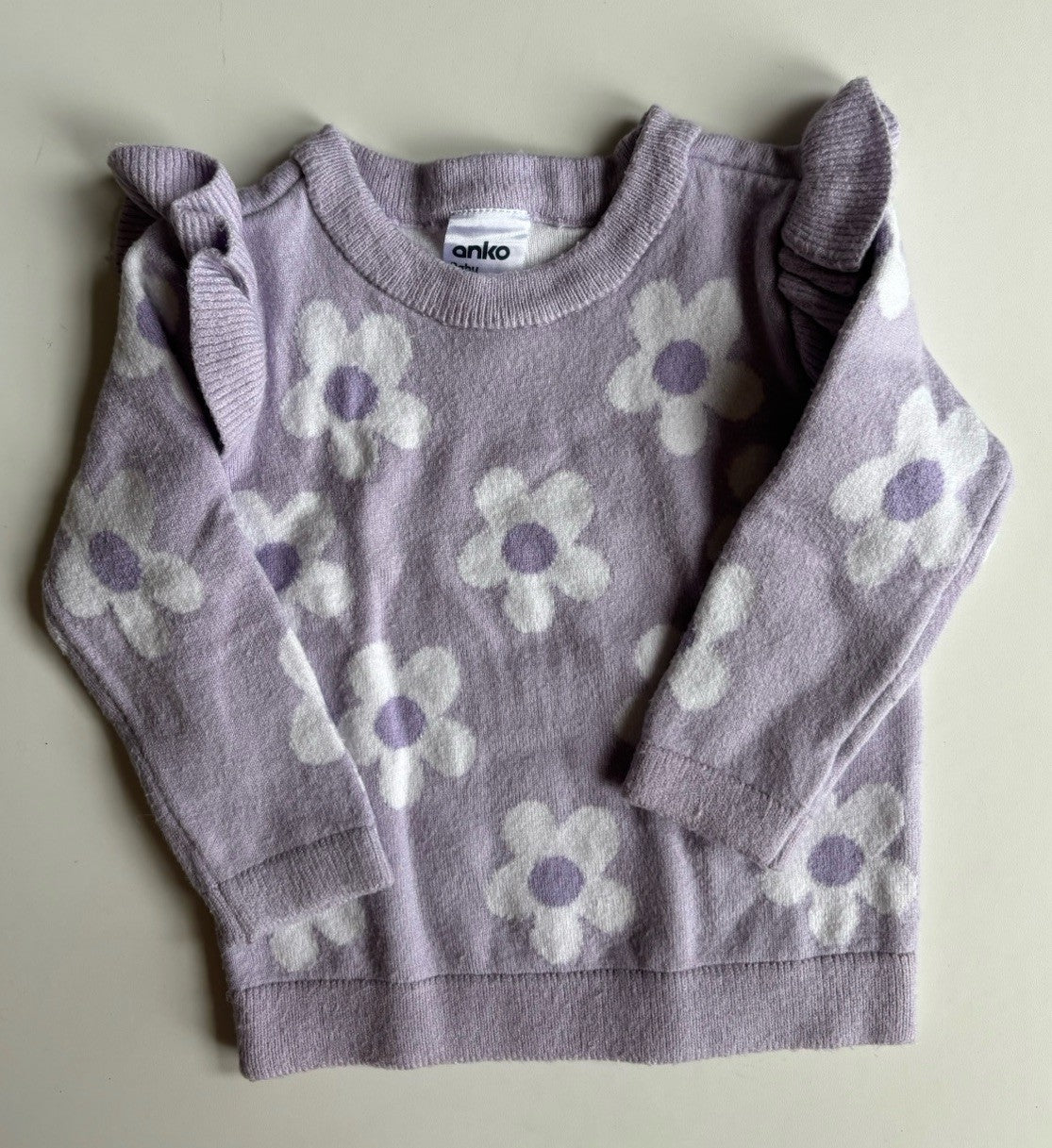 Anko baby girl size 3-6 months purple white floral knit jumper, VGUC