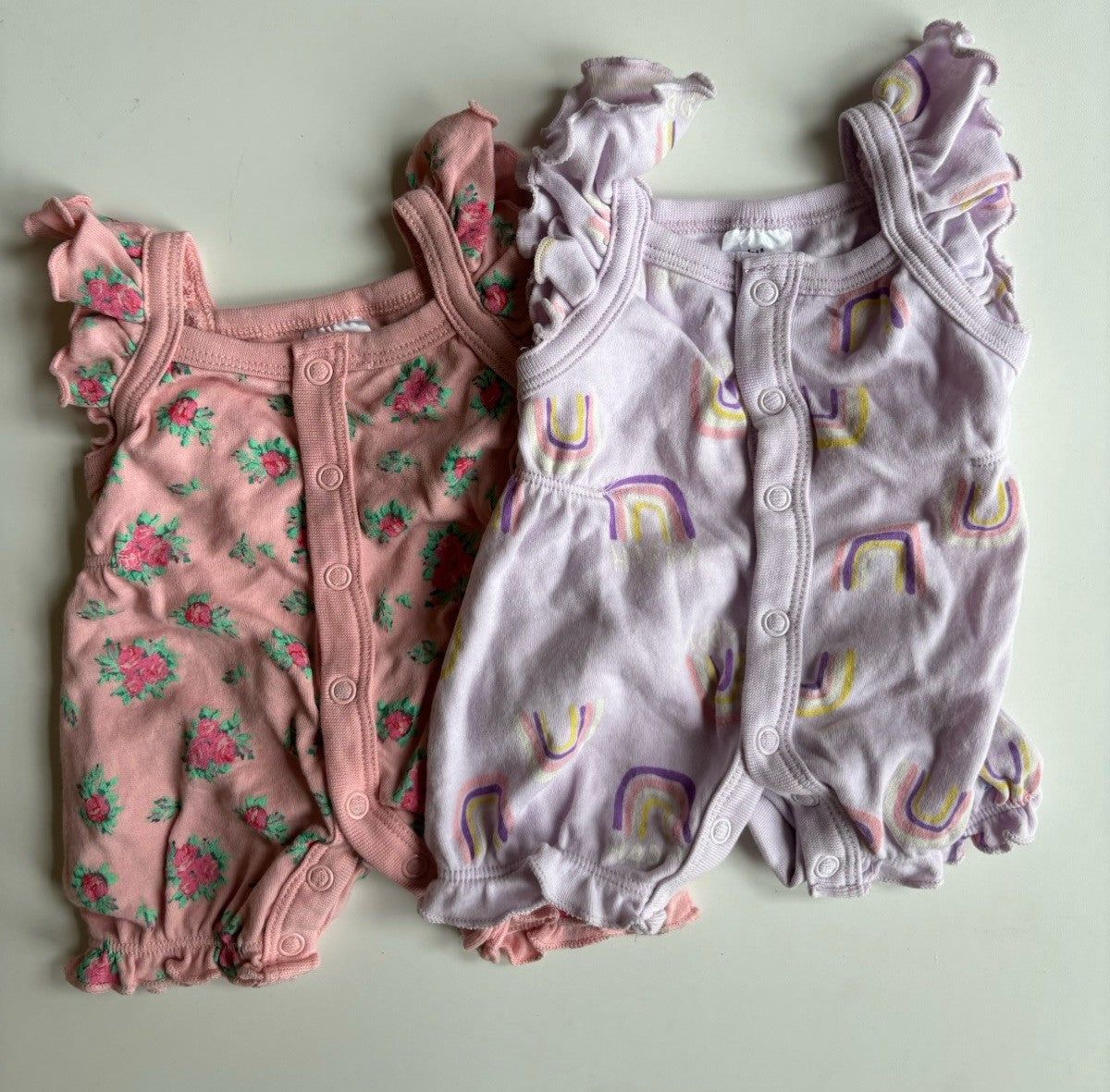 Baby Berry baby girl size small newborn pink floral purple rainbow rompers, VGUC