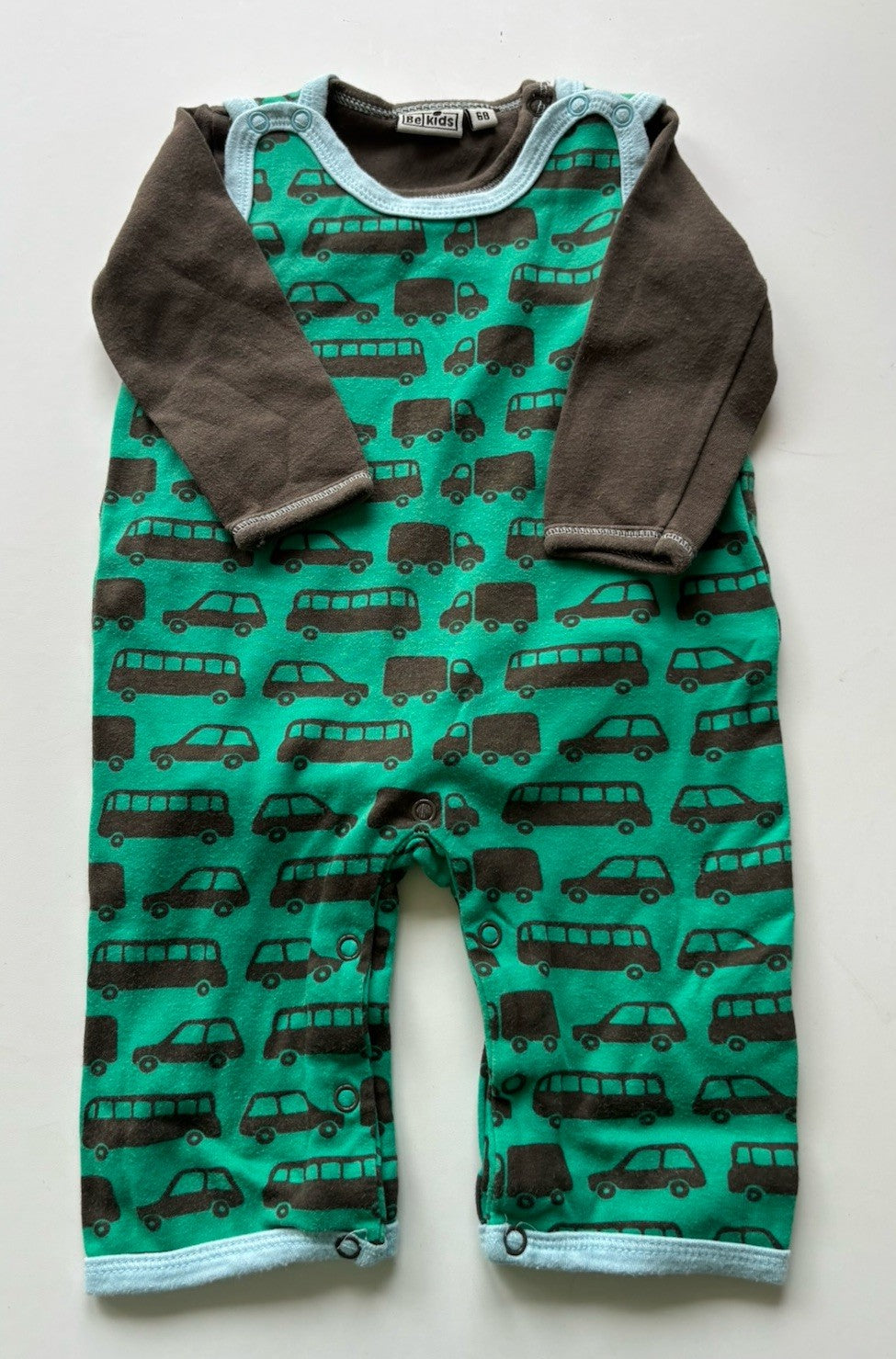 Be Kids baby size 68 (3-6 months) green brown top overalls cars scandi