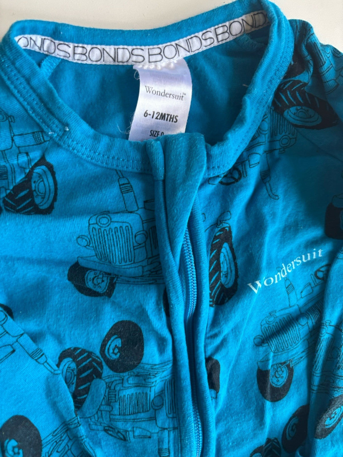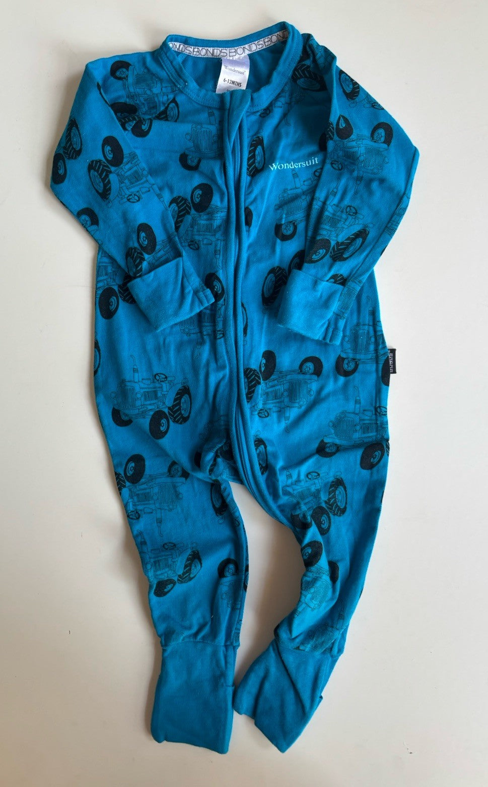 Bonds baby boy size 6-12 months zippy wondersuit blue tractors, VGUC