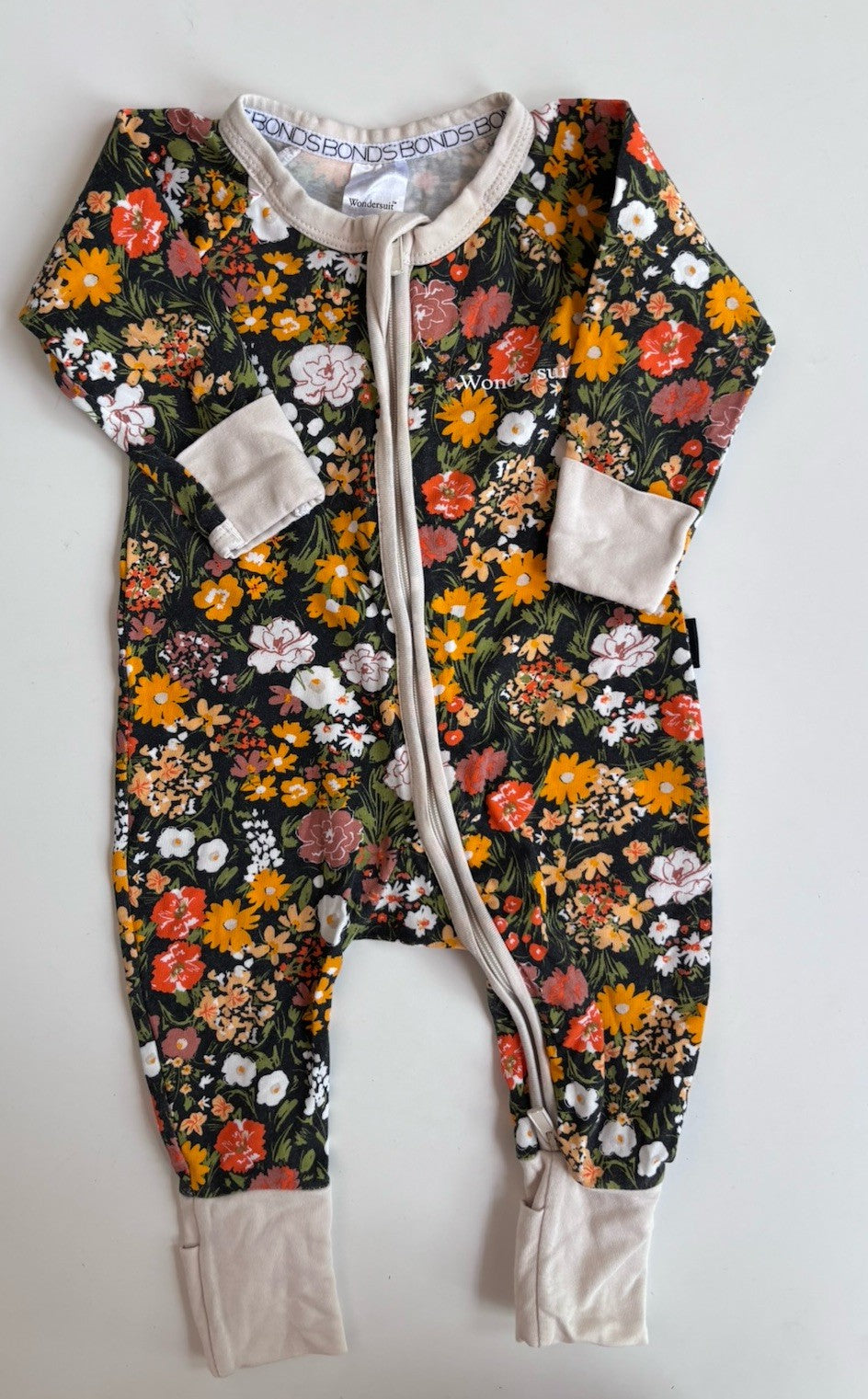 Bonds baby girl size 0-3 months zippy wondersuit black orange floral,
