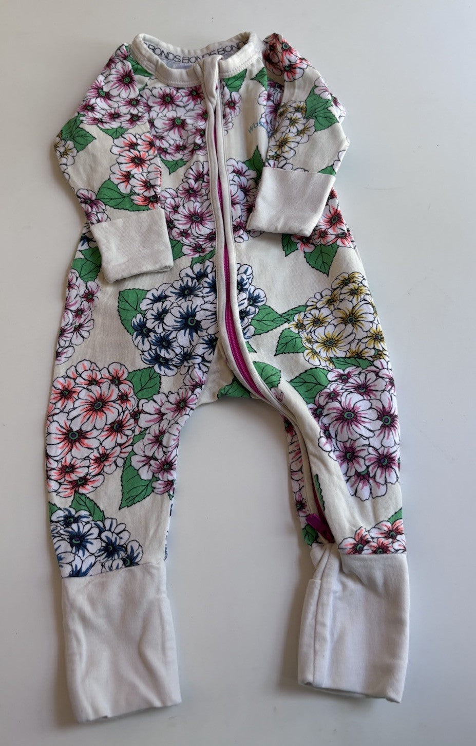 Bonds baby girl size 0-3 months zippy wondersuit cream pink blue floral, VGUC
