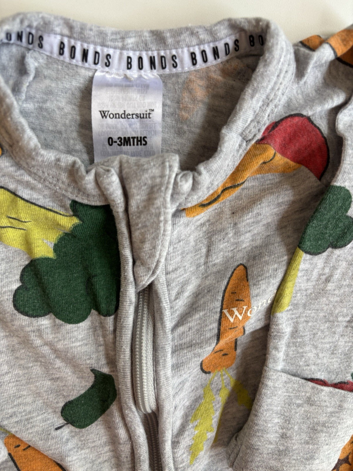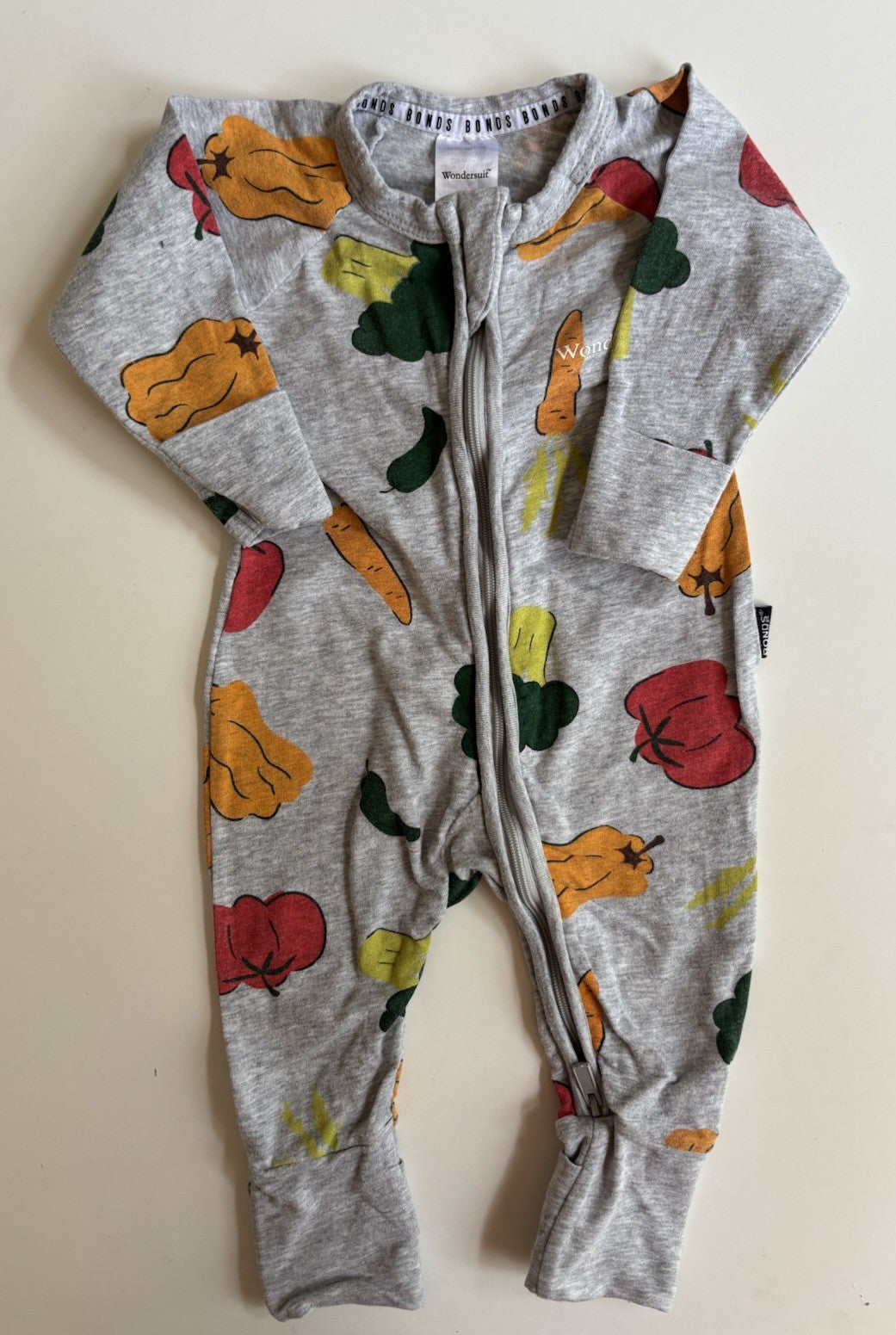 Bonds baby girl size 0-3 months zippy wondersuit grey vegetables, VGUC