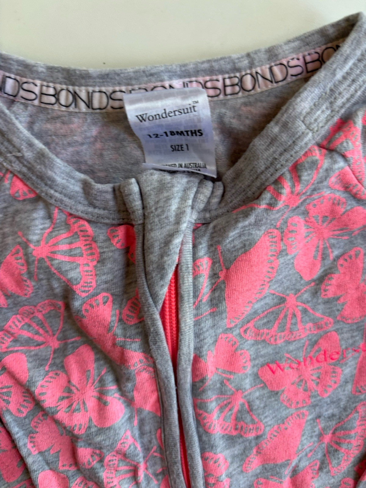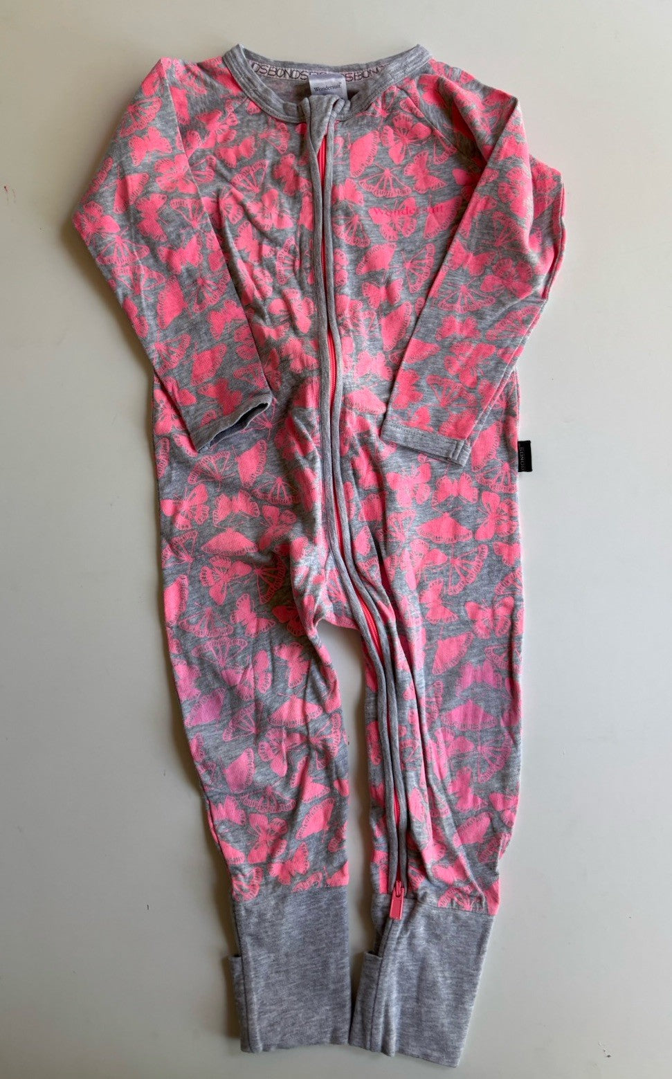 Bonds baby girl size 12-18 months zippy wondersuit grey pink butterflies, VGUC