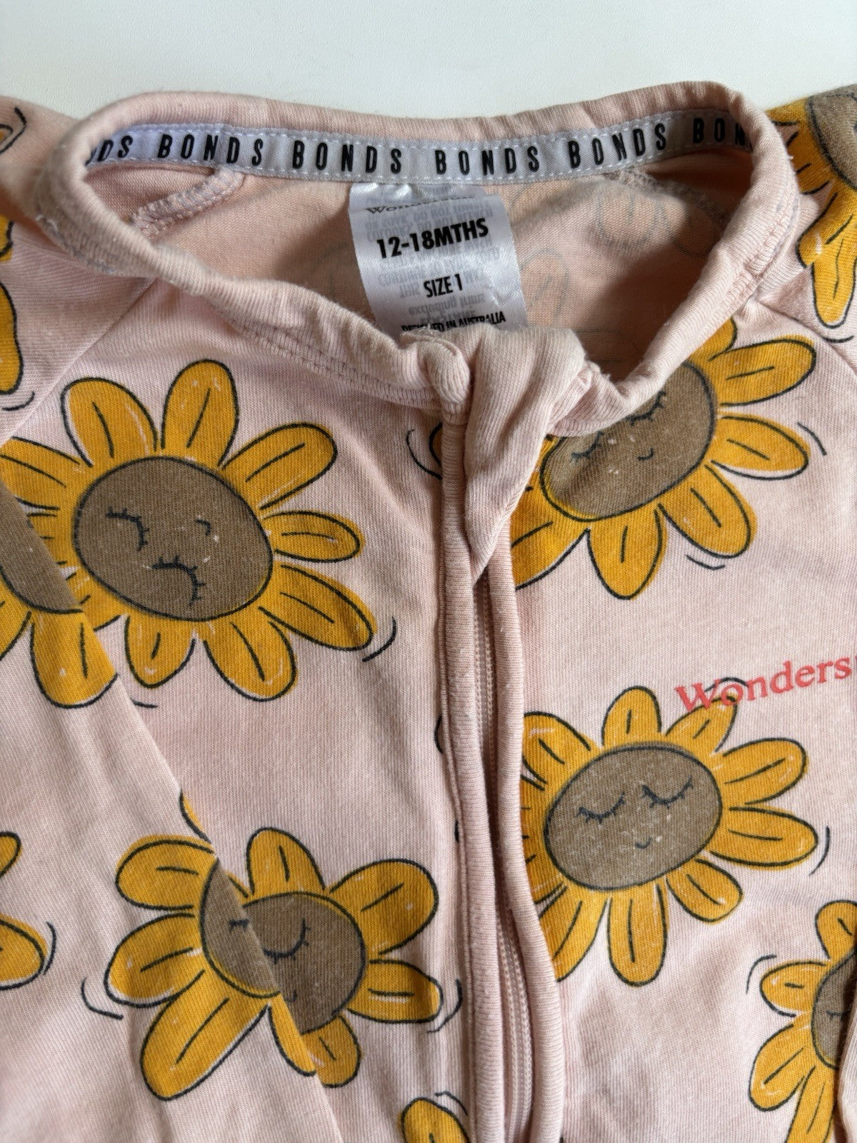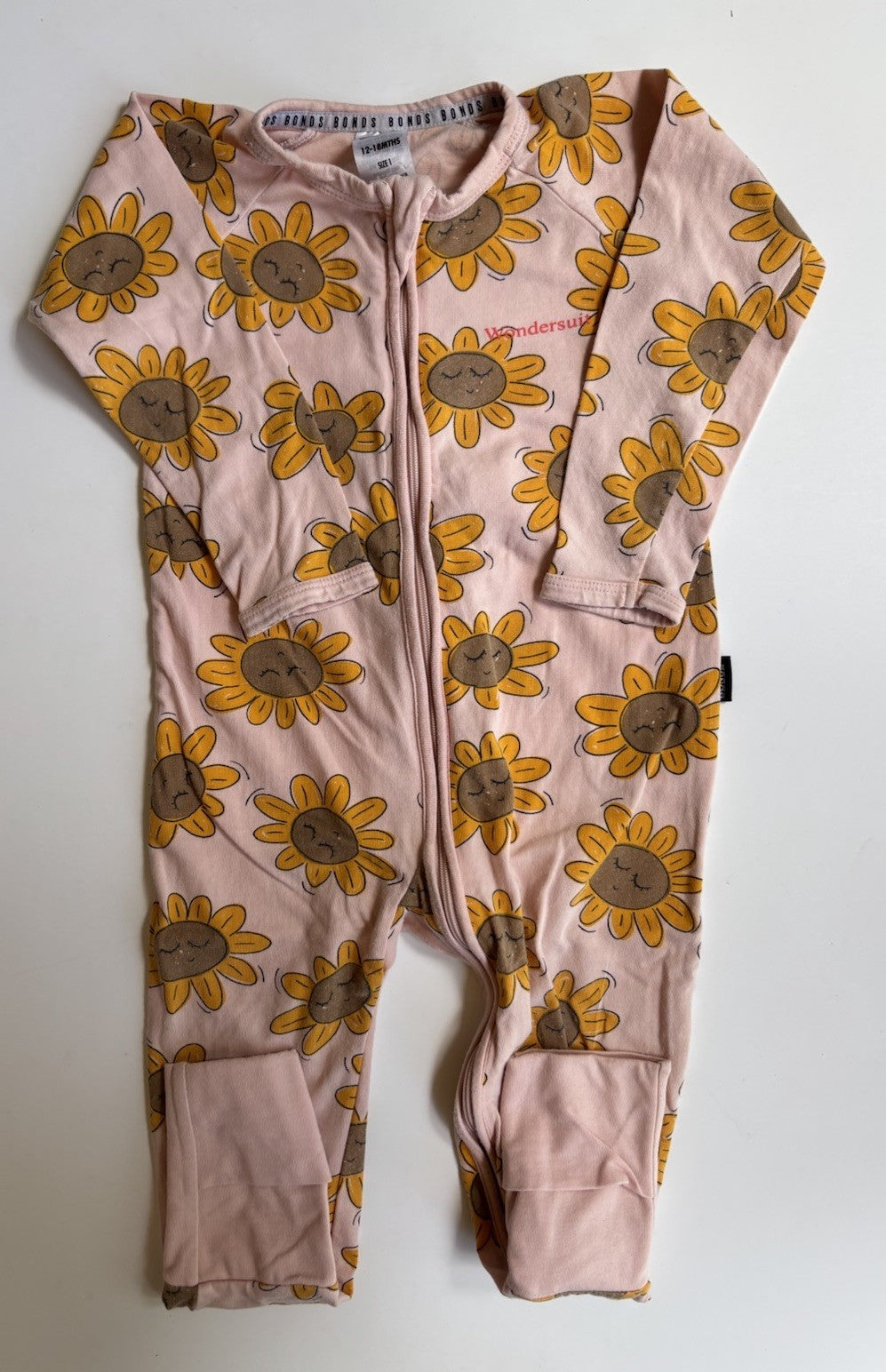 Bonds baby girl size 12-18 months zippy wondersuit pink yellow sunflowers, VGUC