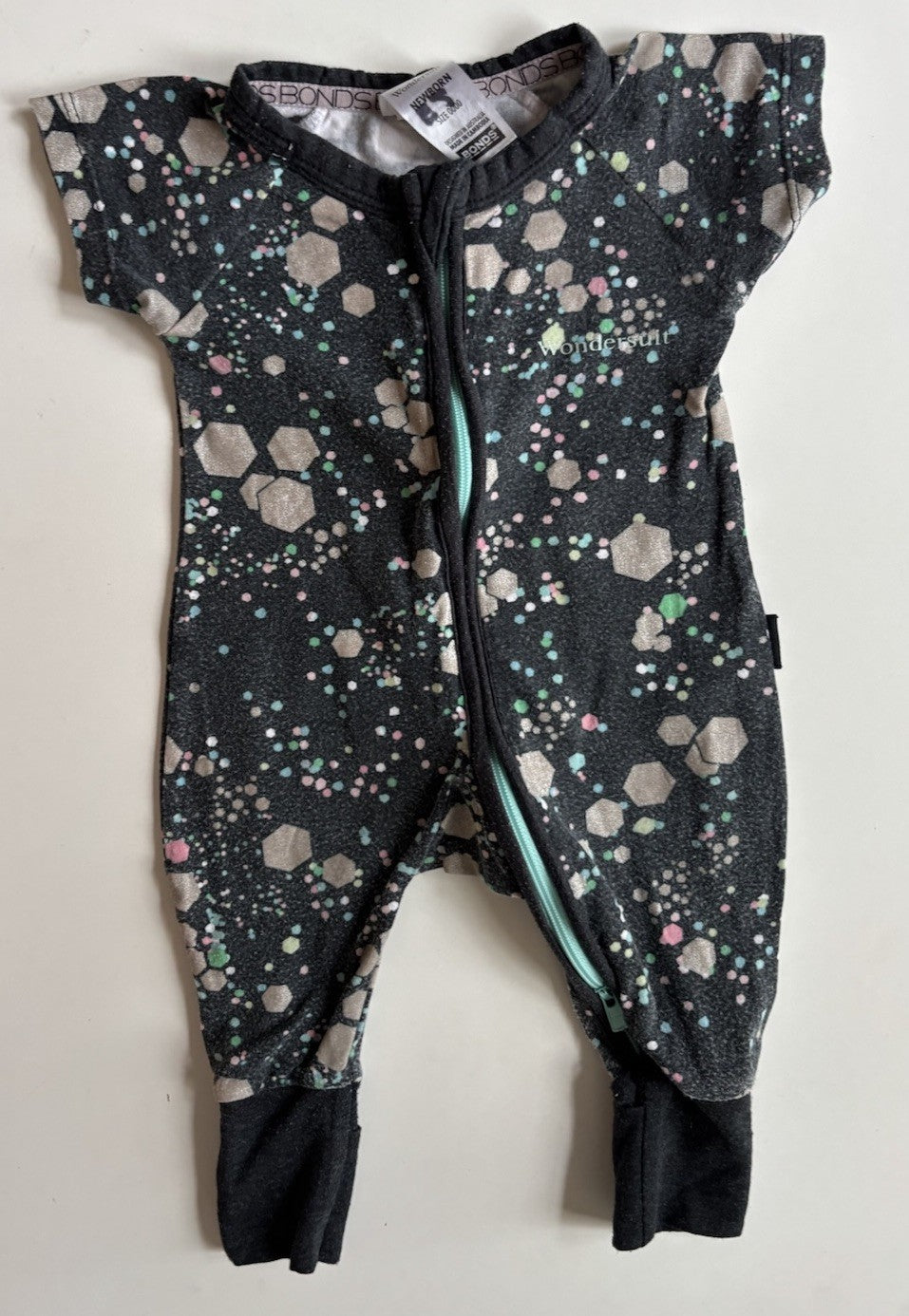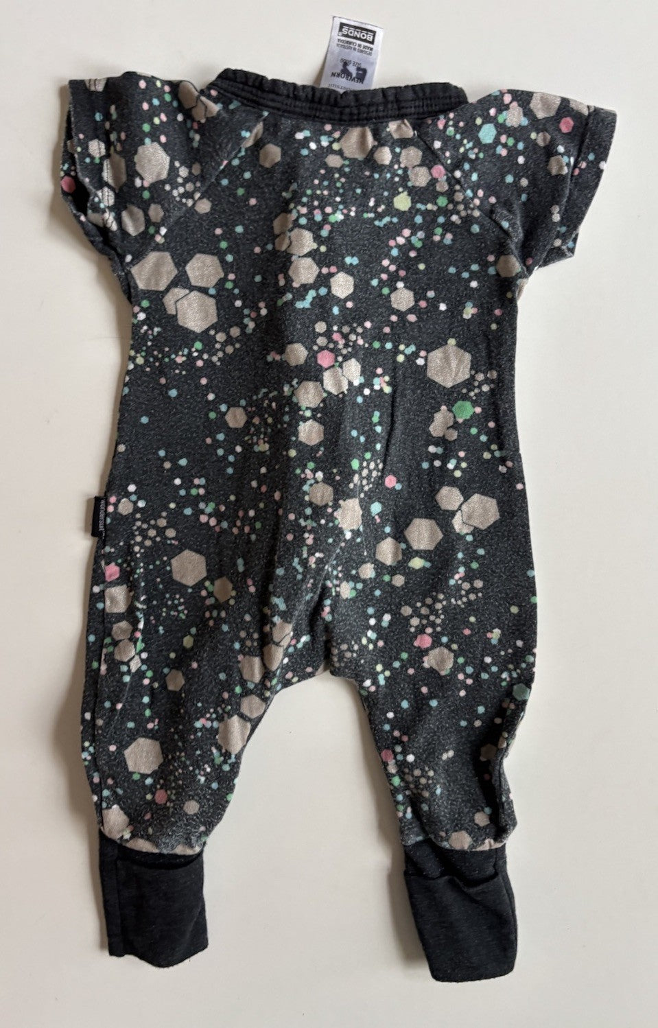 Bonds baby girl size newborn zippy wondersuit black silver shapes, GUC