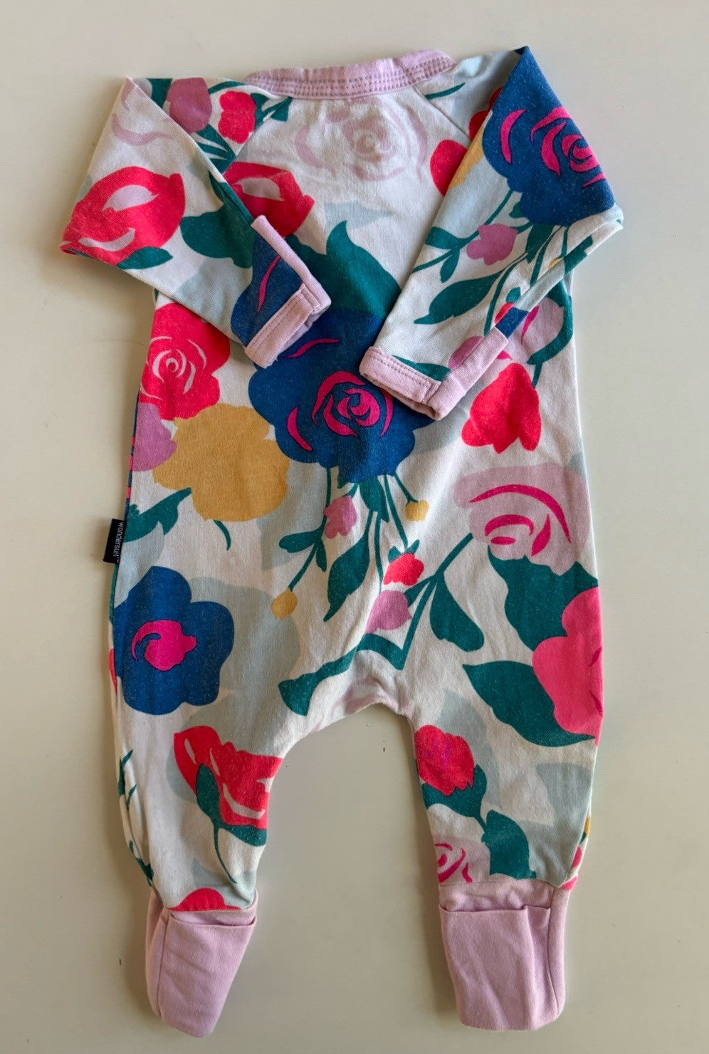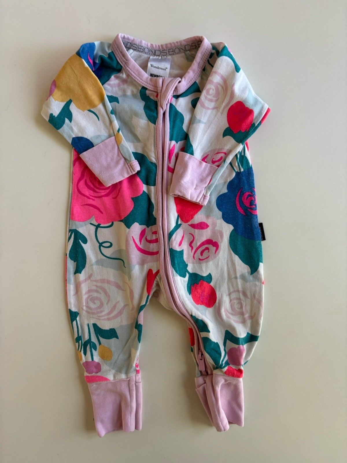 Bonds baby girl size newborn zippy wondersuit pink blue floral, GUC