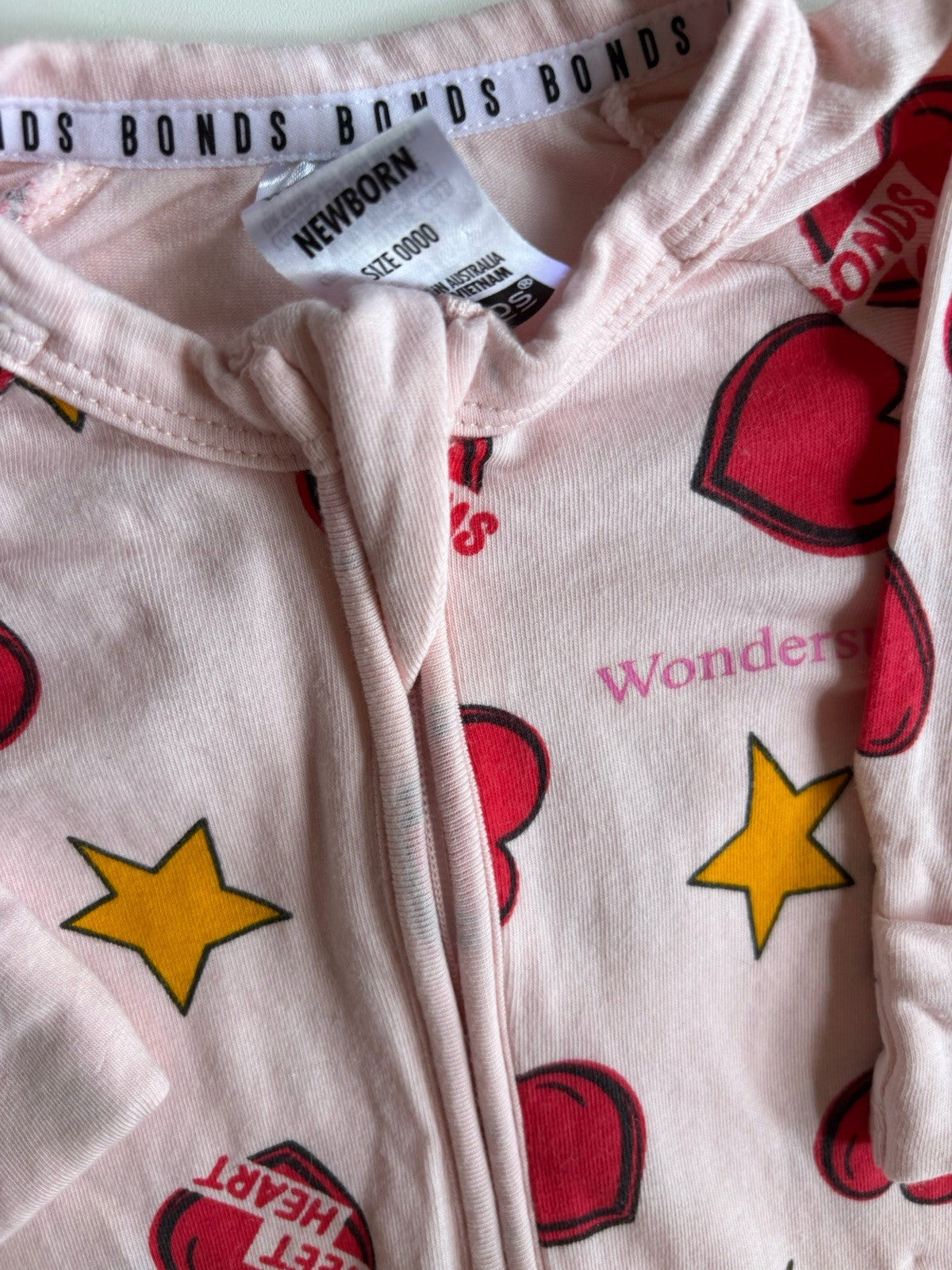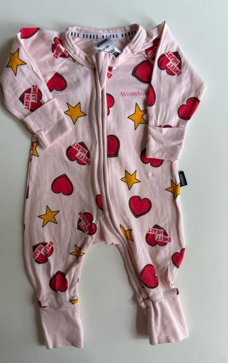 Bonds baby girl size newborn zippy wondersuit pink hearts stars, VGUC