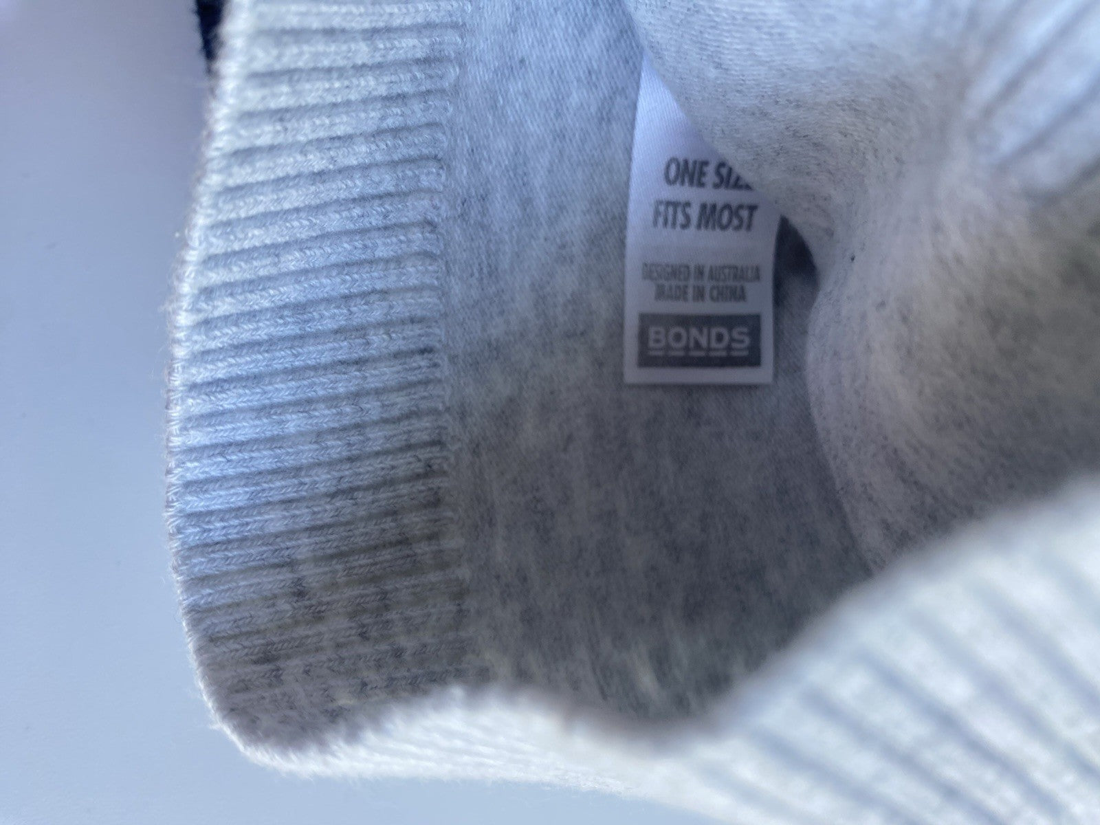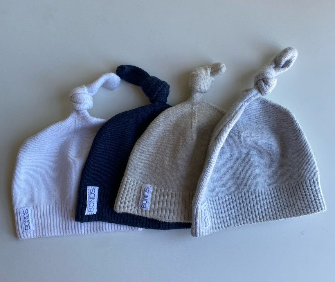 Bonds baby one size x4 blue grey white knit knotted beanies bundle, VGUC