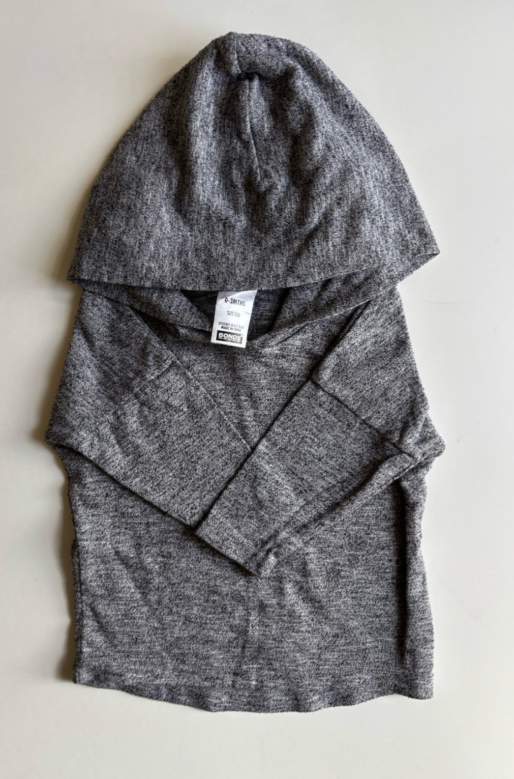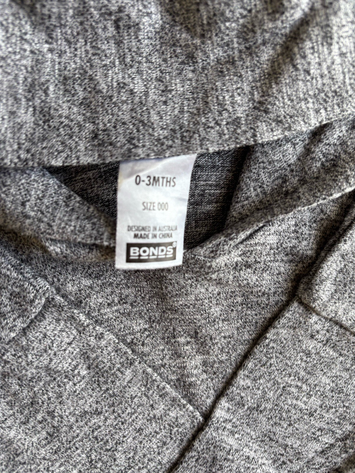 Bonds baby size 0-3 months grey marle long sleeve hooded top, VGUC