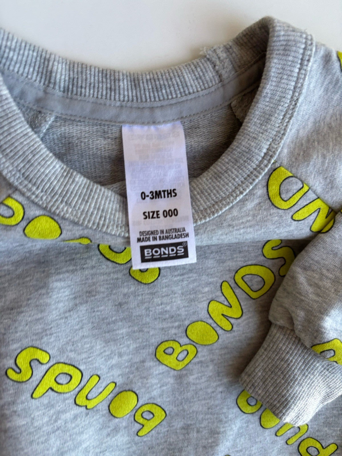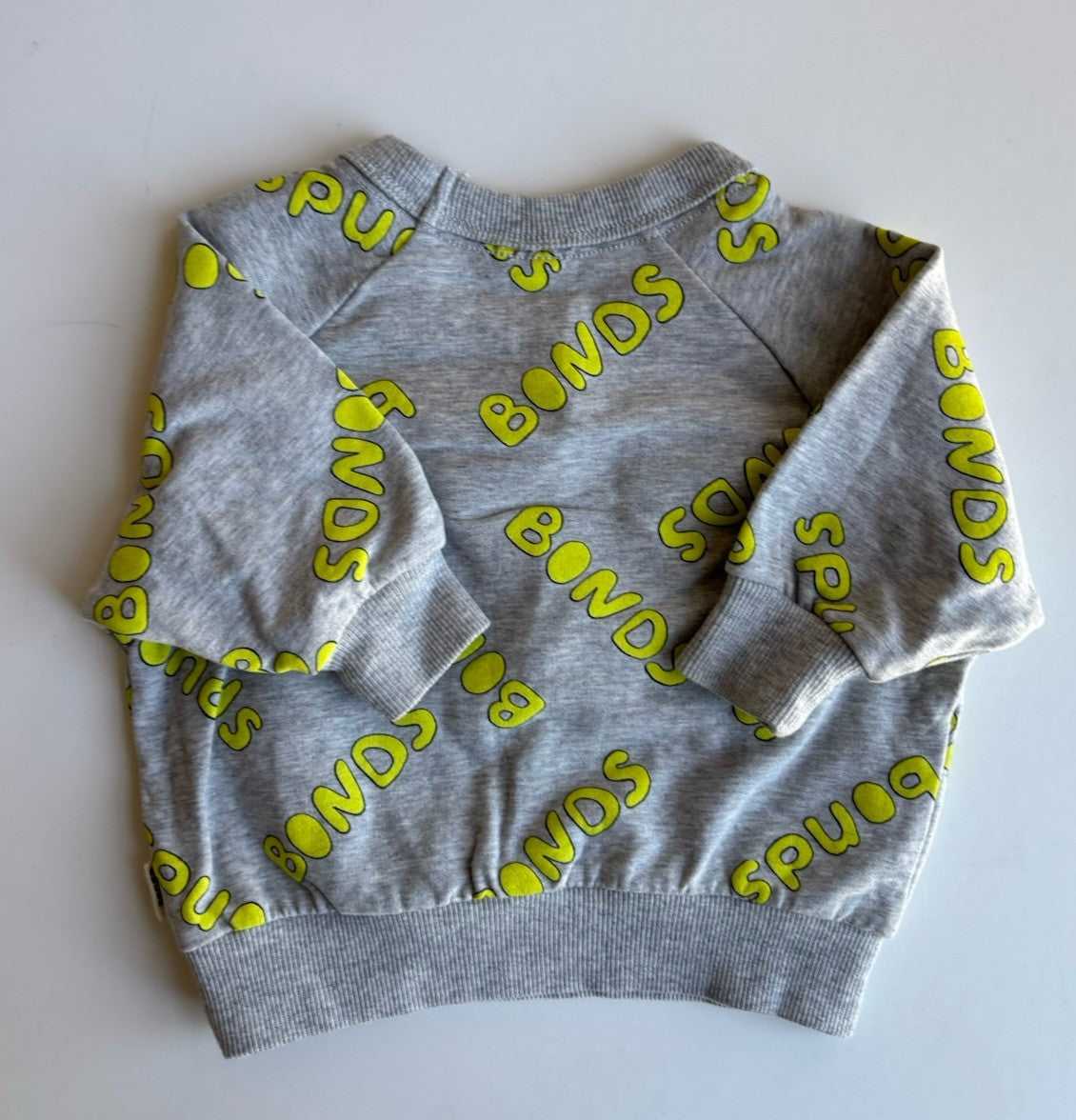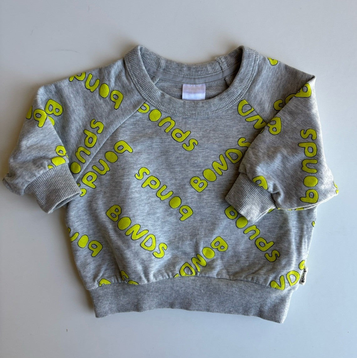 Bonds baby size 0-3 months grey yellow logo pullover jumper, EUC