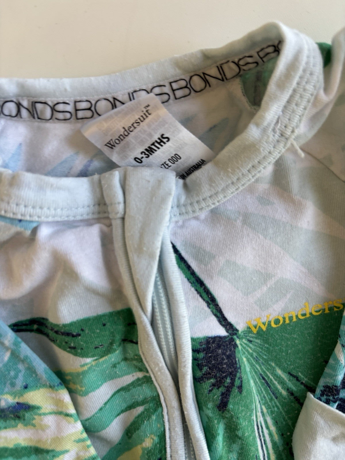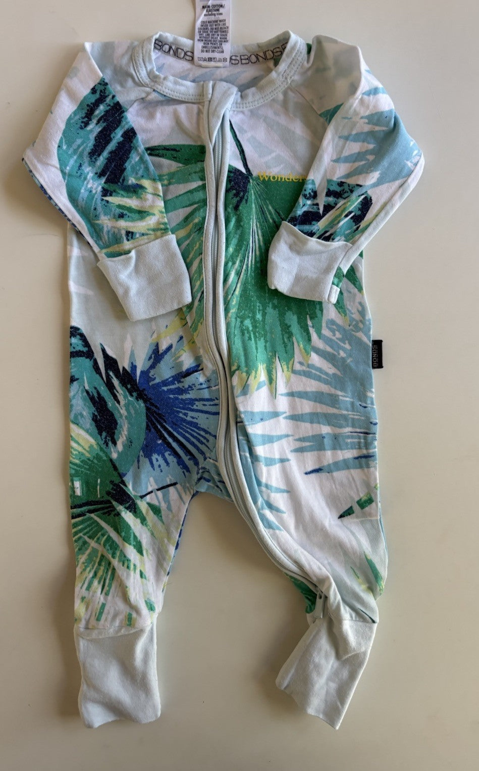 Bonds baby size 0-3 months zippy wondersuit blue green ferns, GUC
