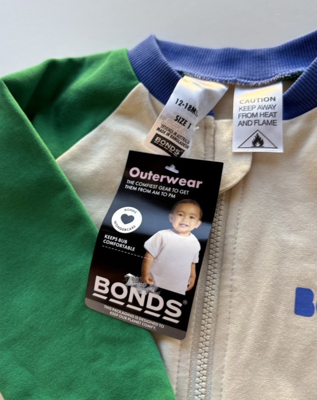 Bonds baby size 12-18 months green blue beige fleecy one-piece zip, BN