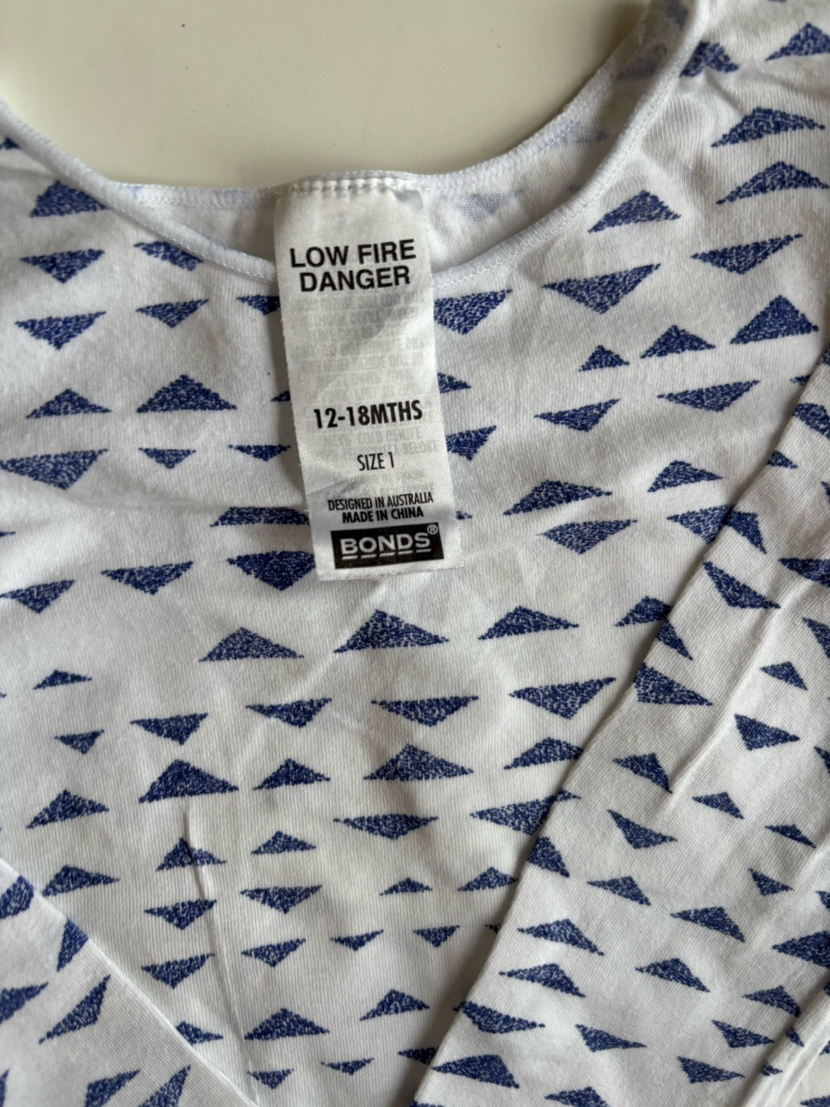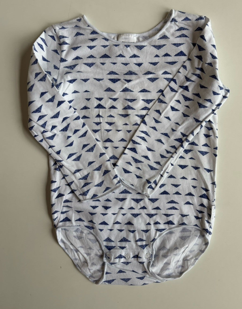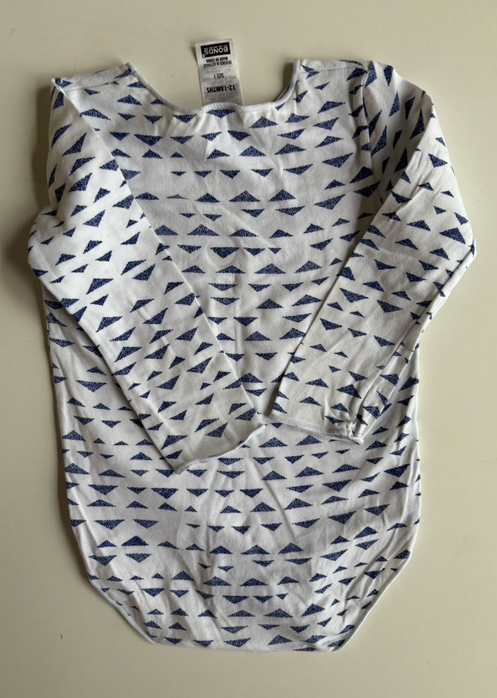 Bonds baby size 12-18 months white blue triangles bodysuit top, VGUC