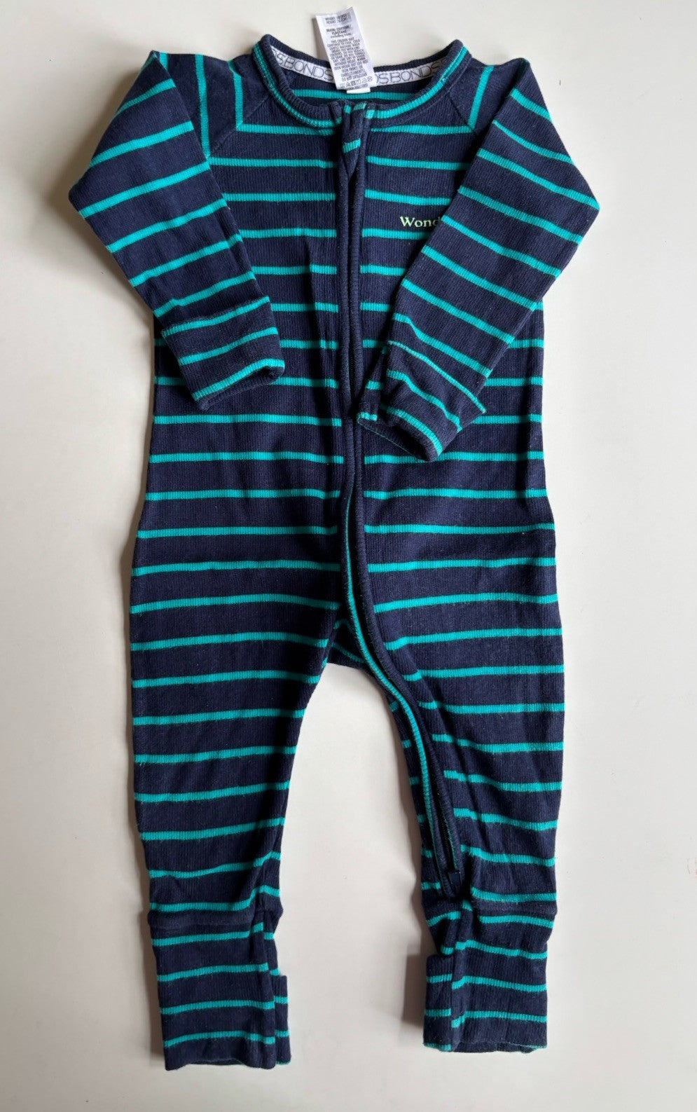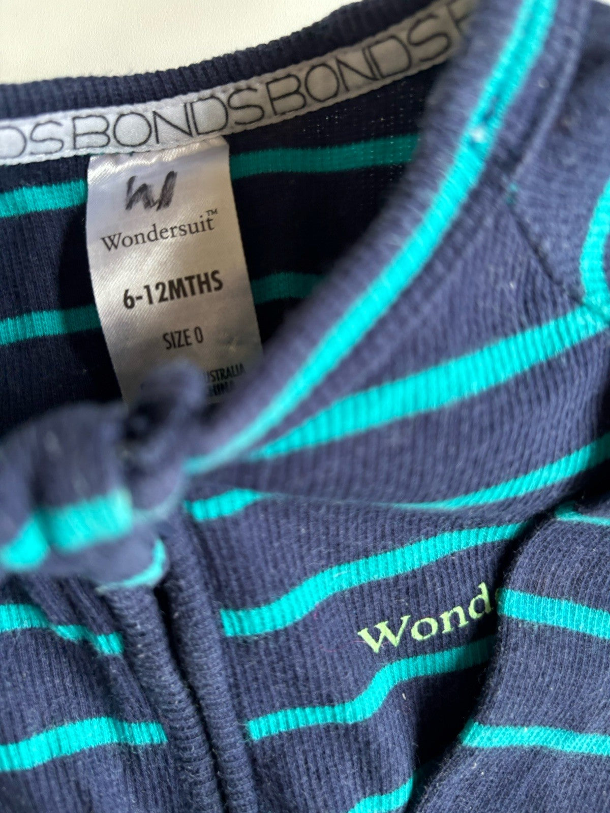 Bonds baby size 6-12 months zippy wondersuit blue green stripe ribbed, VGUC