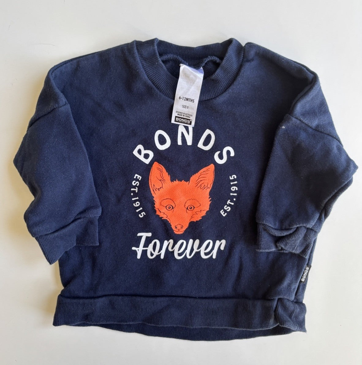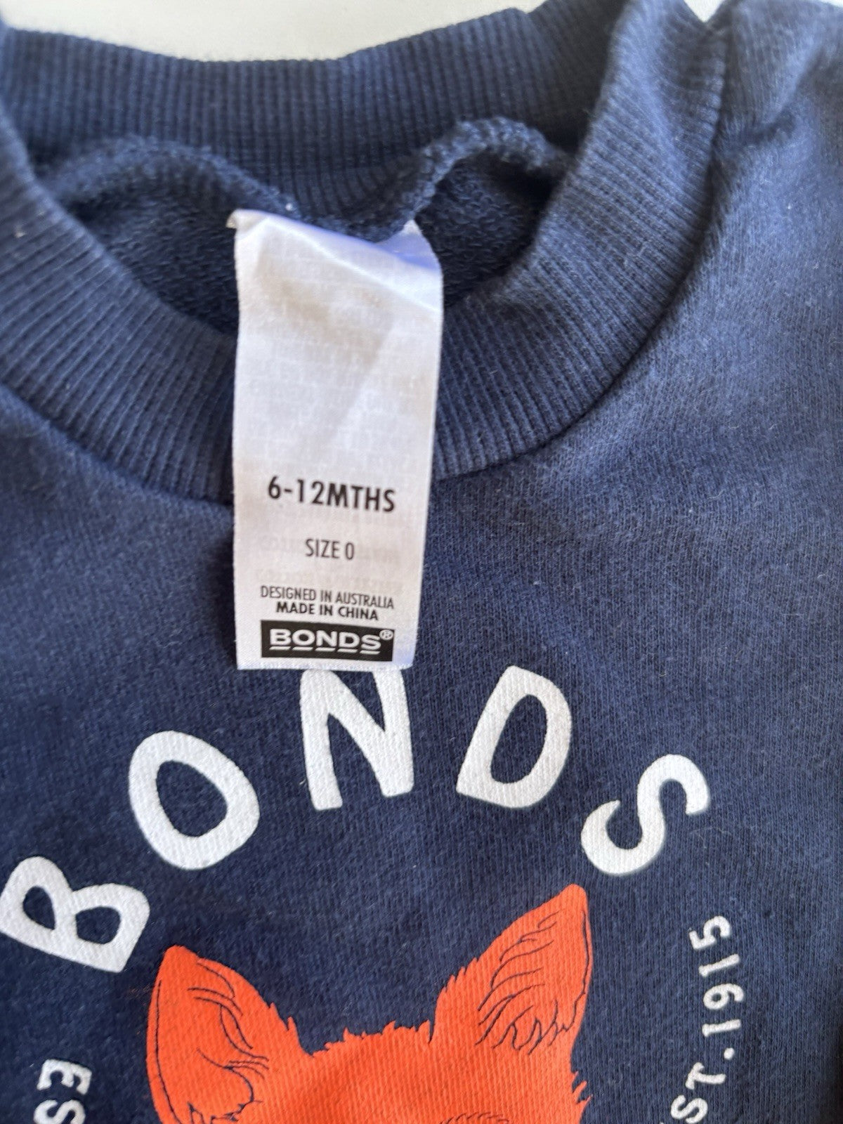 Bonds baby size 6-12 months navy blue fox pullover jumper, VGUC