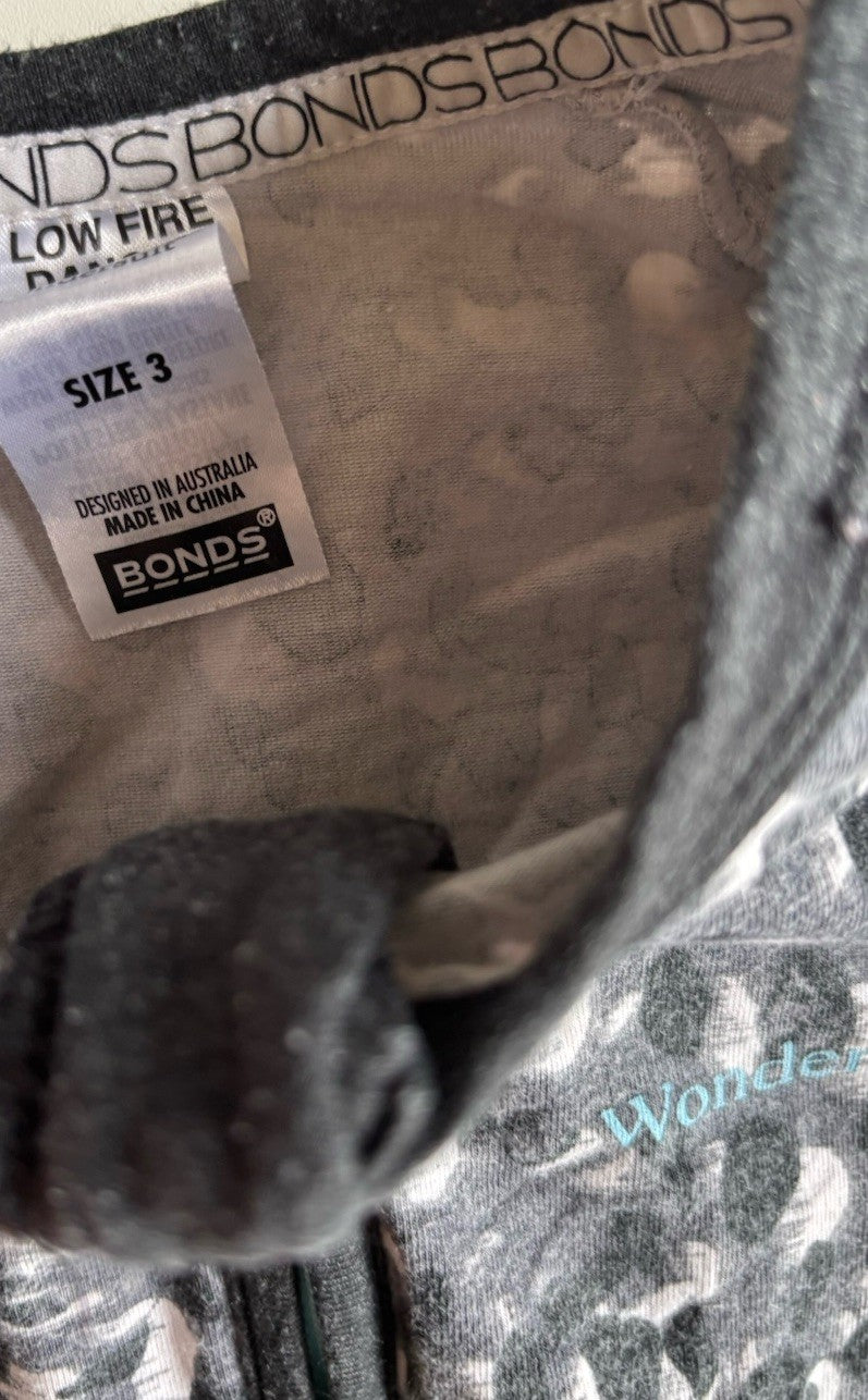 Bonds kids toddler size 3 zippy wondersuit black grey patterned PJs, VGUC