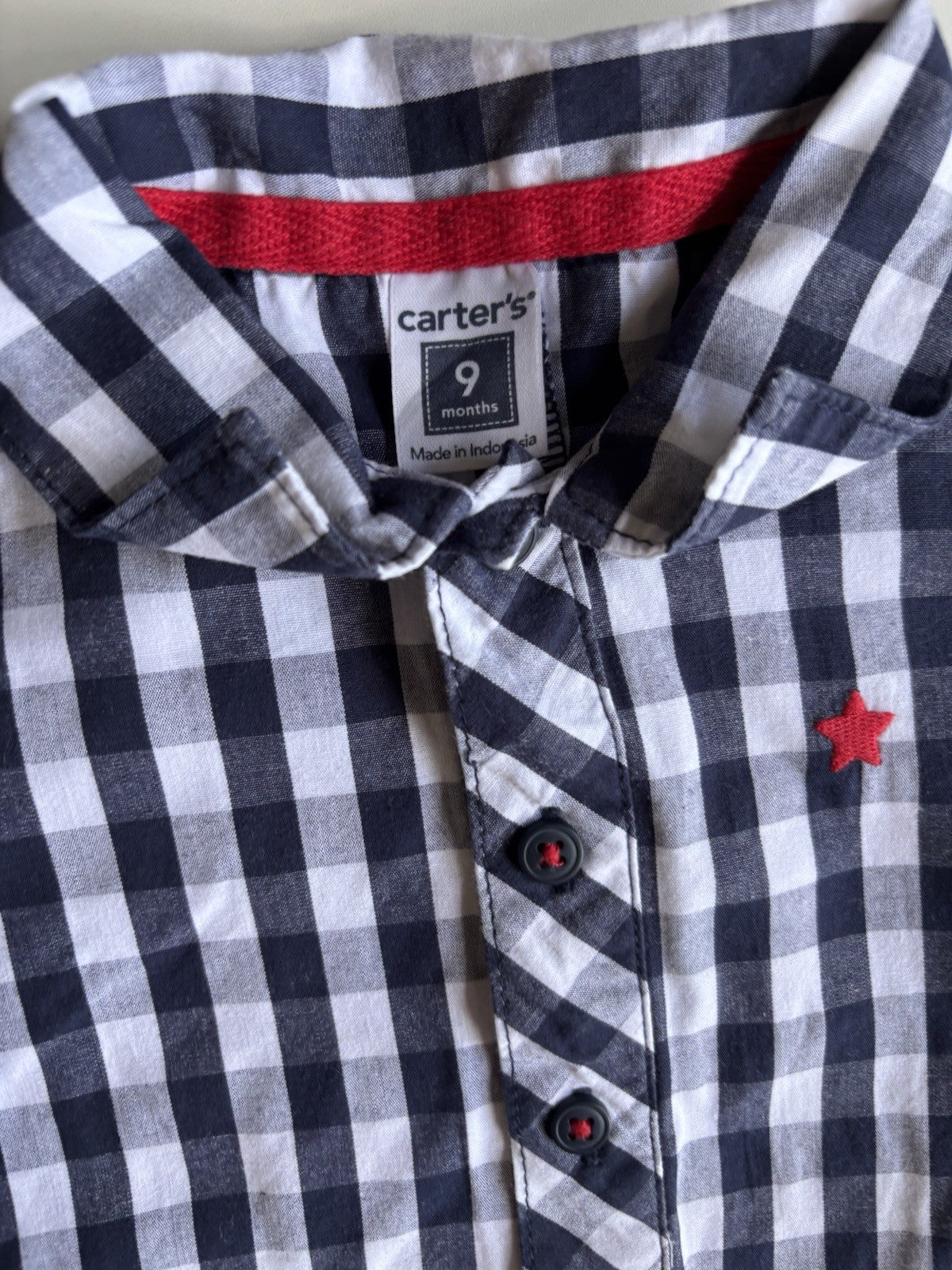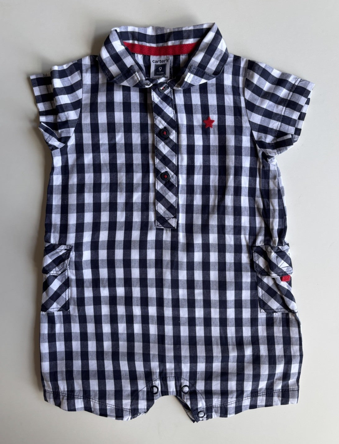Carter's baby boy size 6-9 months navy blue white check collared romper, VGUC