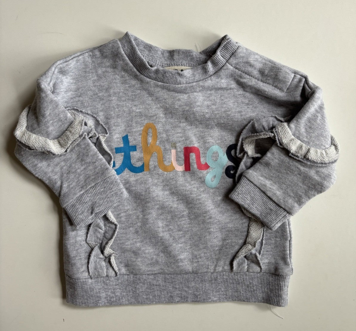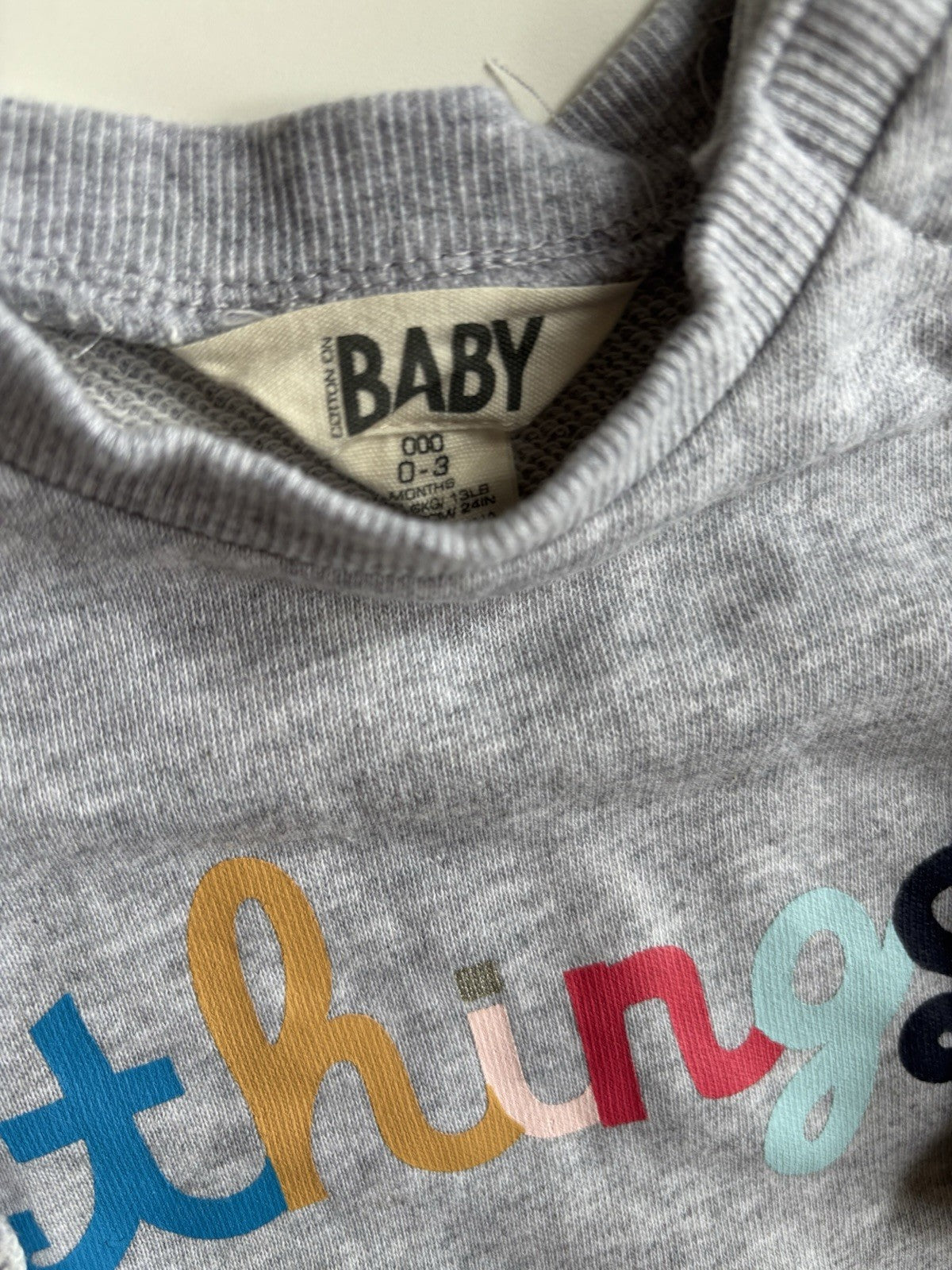 Cotton On baby girl size 0-3 months grey frill 'Things' jumper, VGUC