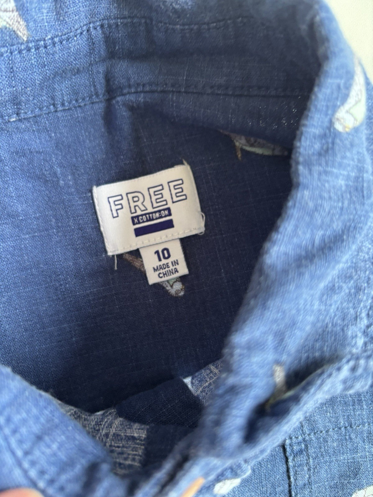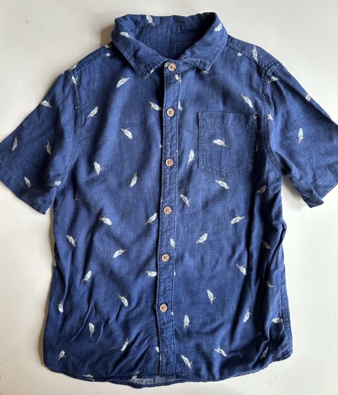 Cotton On Free kids boys size 10 blue birds linen blend shirt, VGUC