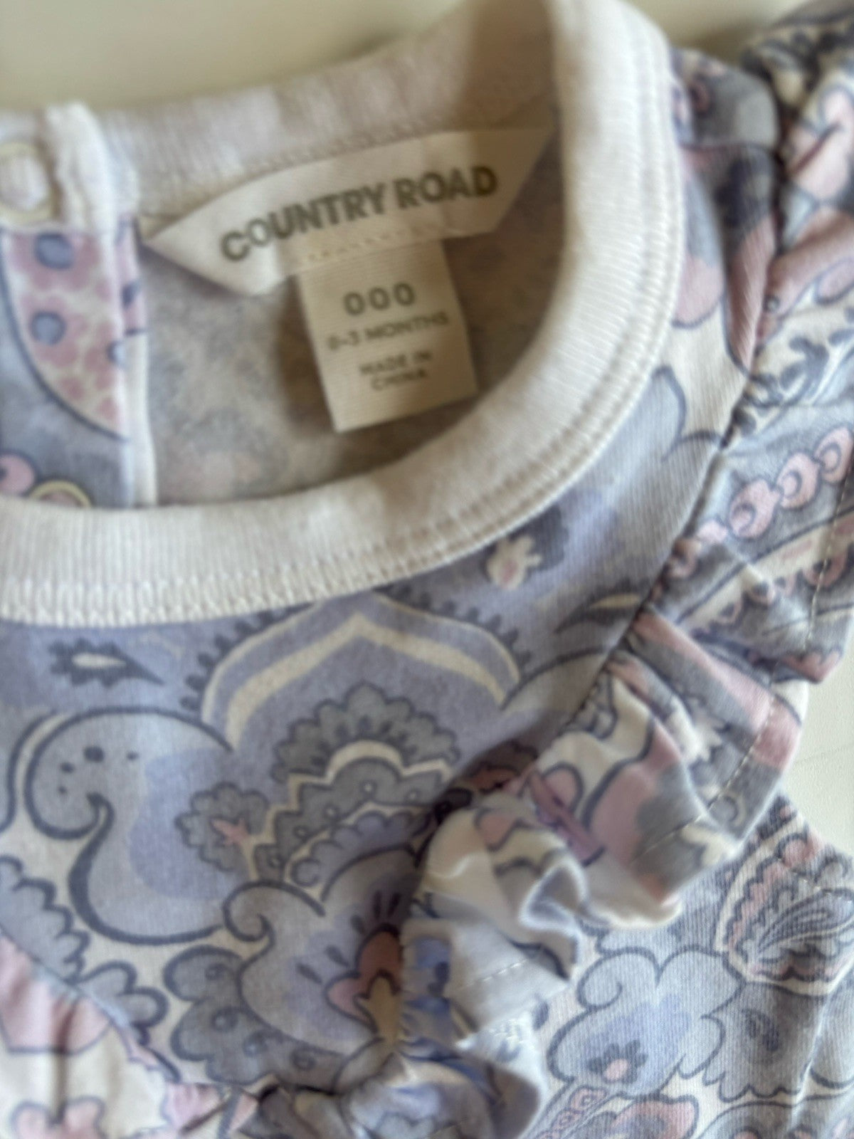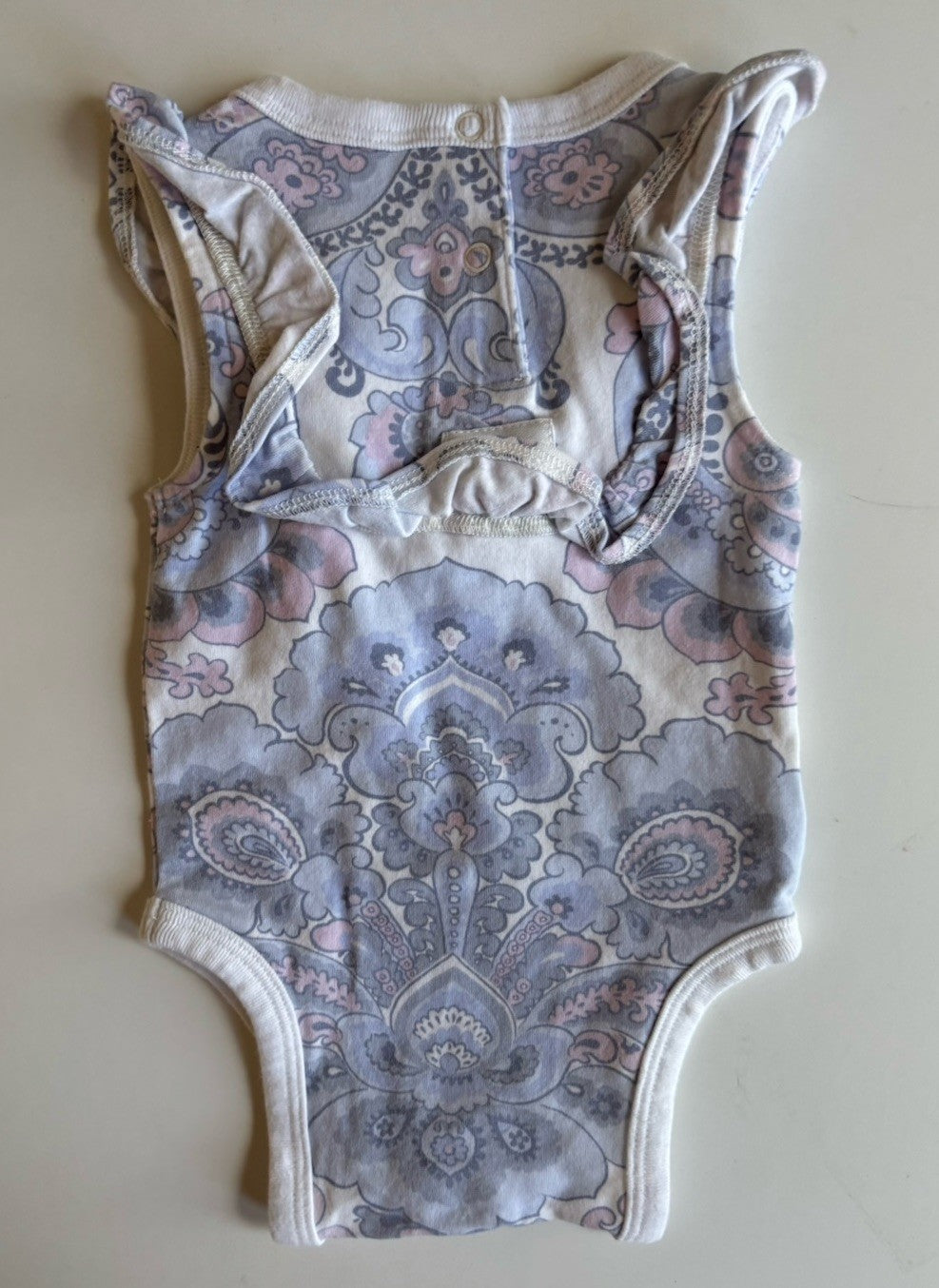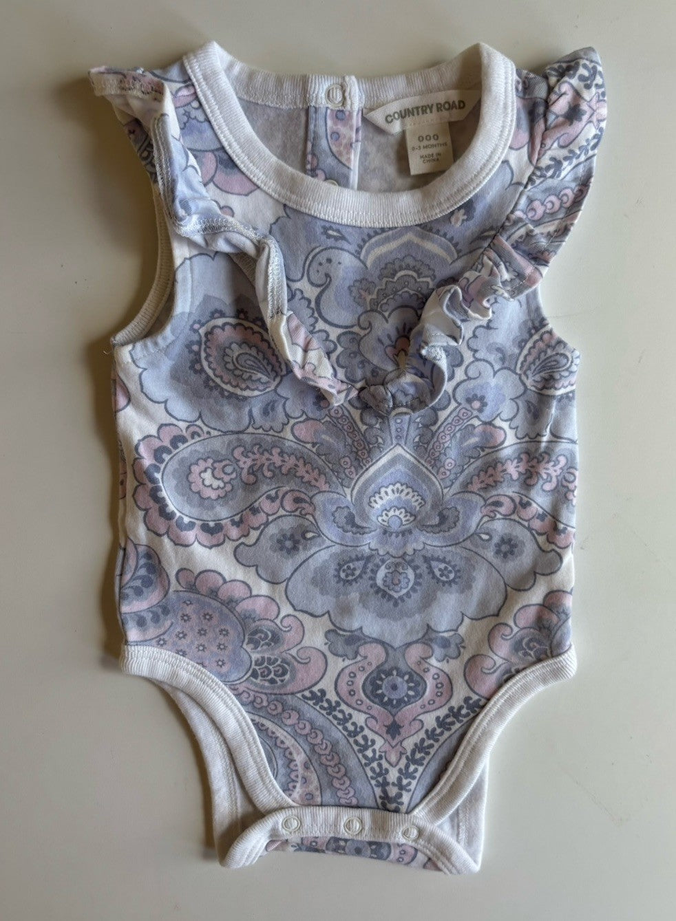 Country Road baby girl size 0-3 months purple paisley bodysuit top, VG