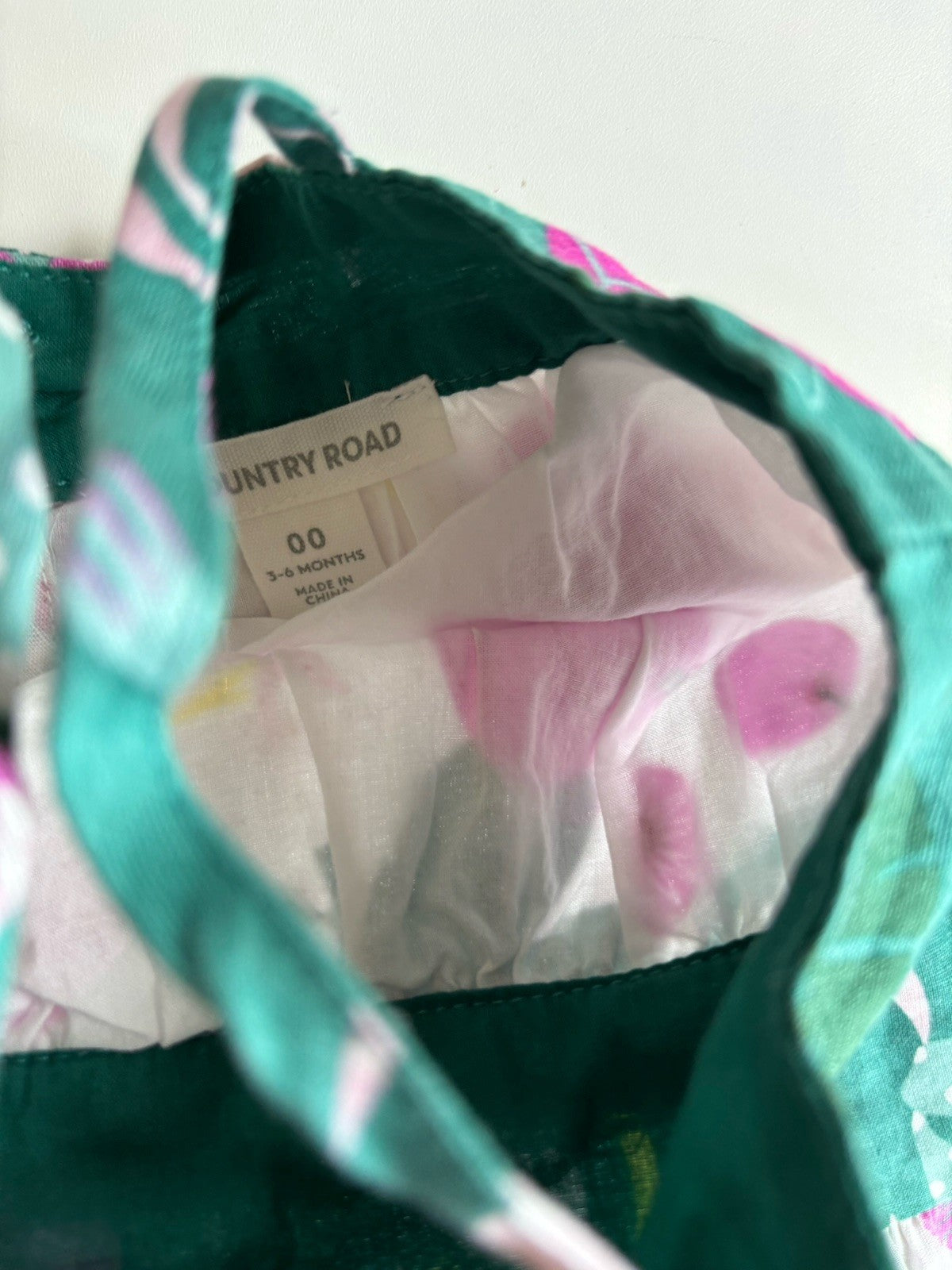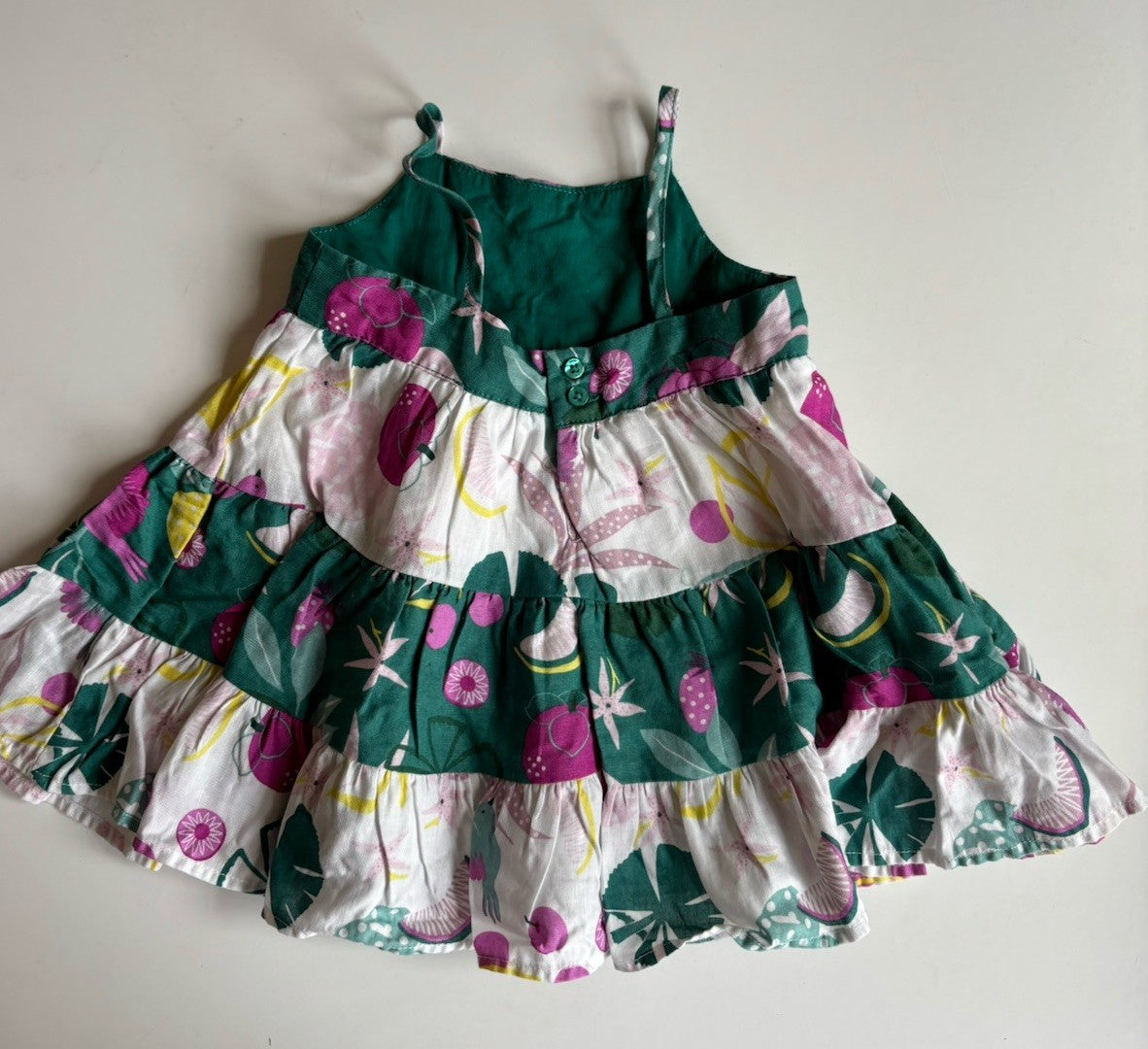Country Road baby girl size 3-6 months pink green birds fruit dress, VGUC