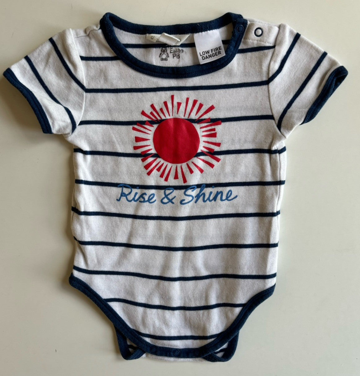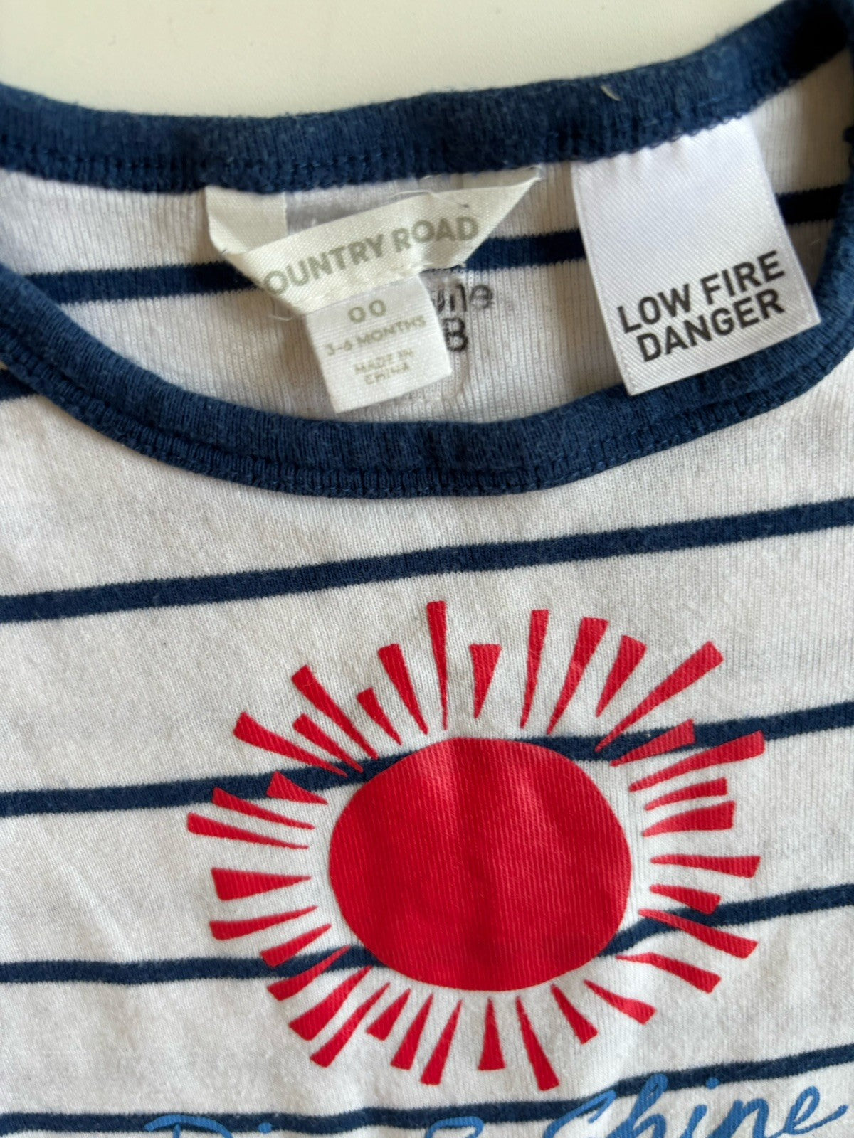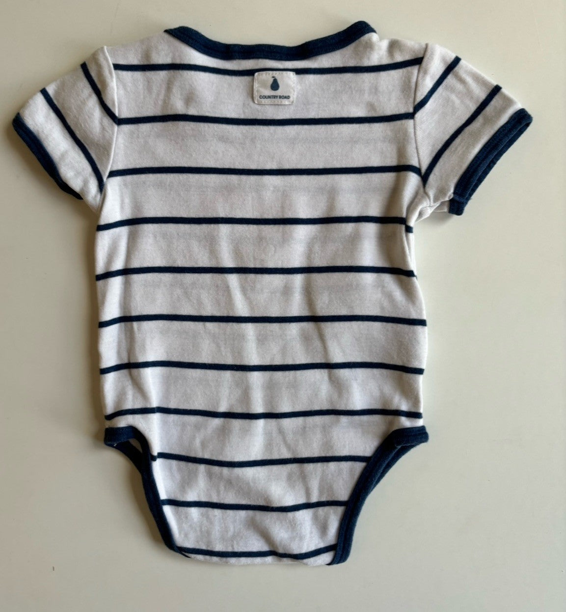 Country Road baby size 3-6 months blue white stripe bodysuit sun, VGUC