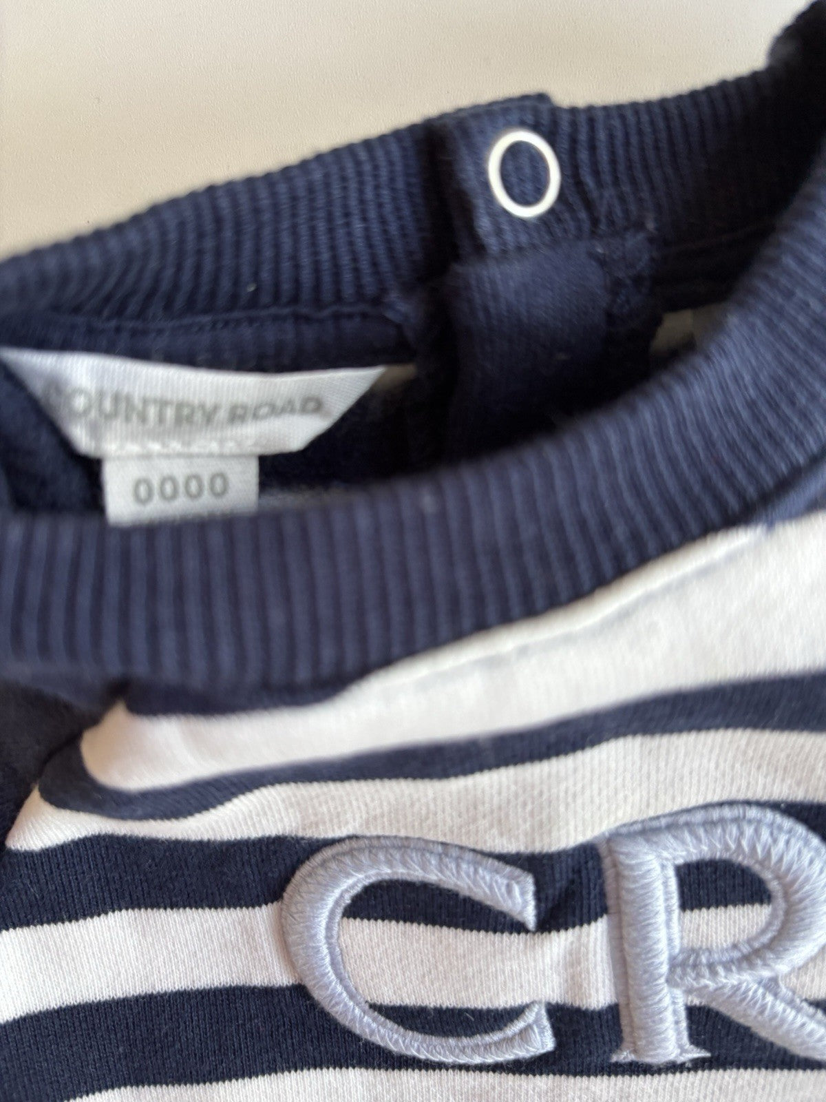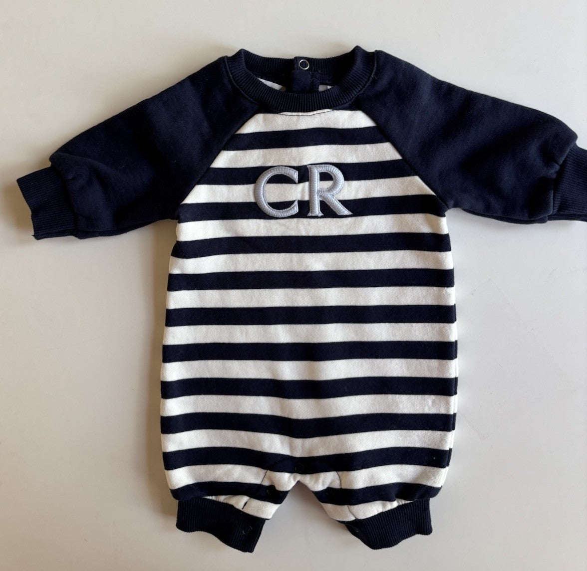 Country Road baby size newborn navy blue white stripe fleecy one-piece, EUC