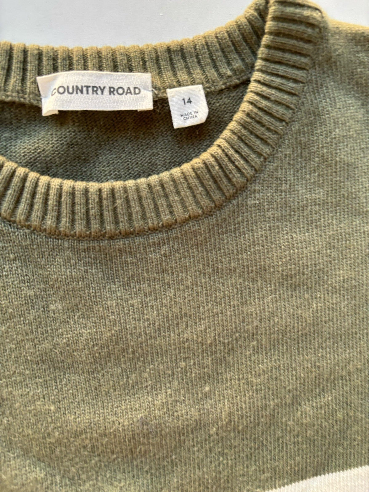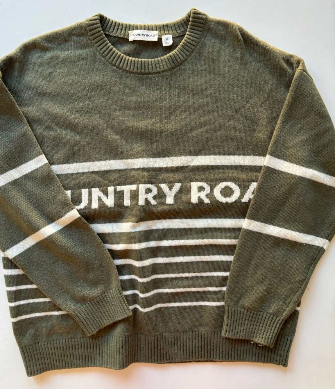 Country Road kids size 14 green white wool blend stripe logo jumper, VGUC