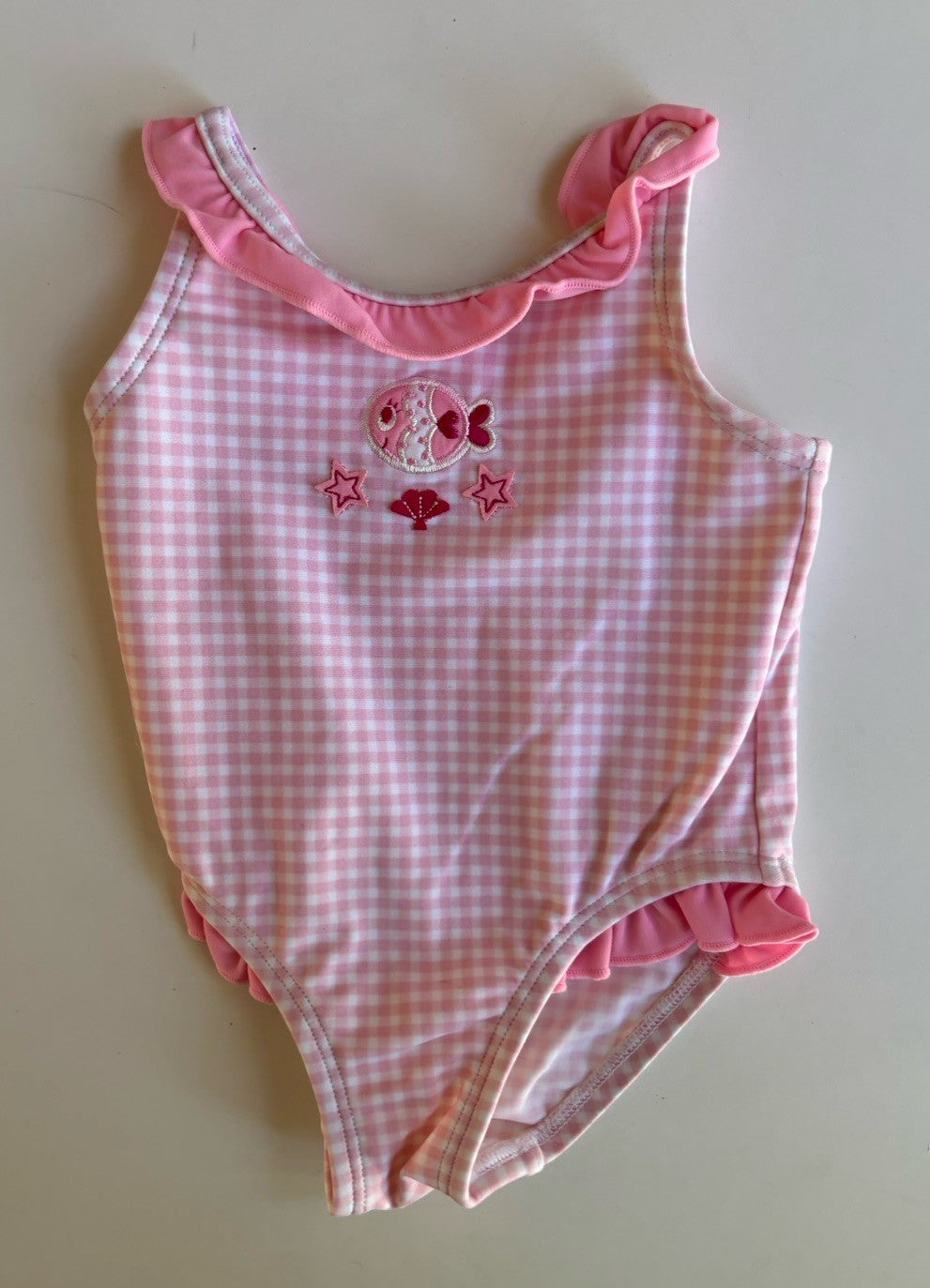 Debenhams baby girl size 0-3 months pink check bathers fish, VGUC