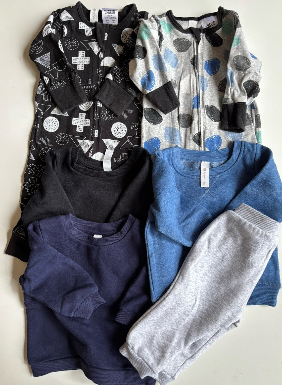 Dymples baby boy size 3-6 months black blue grey tops pants bundle, VGUC