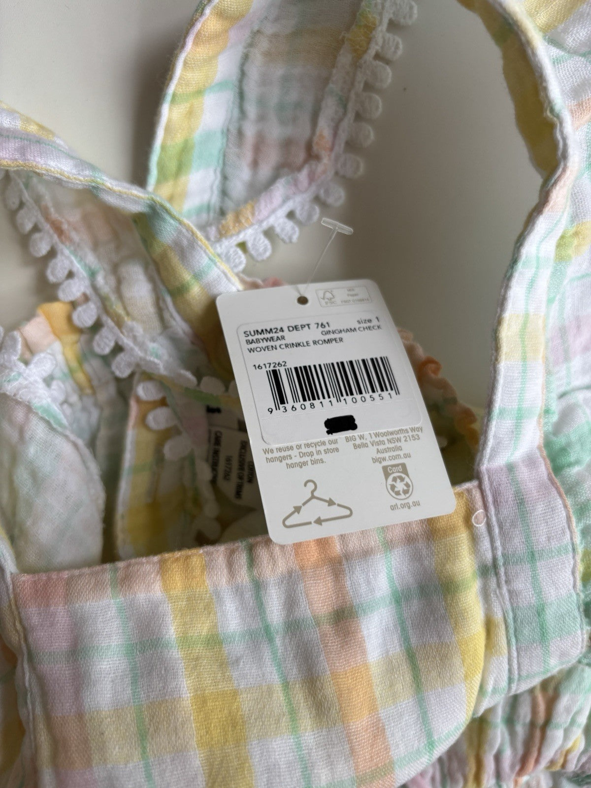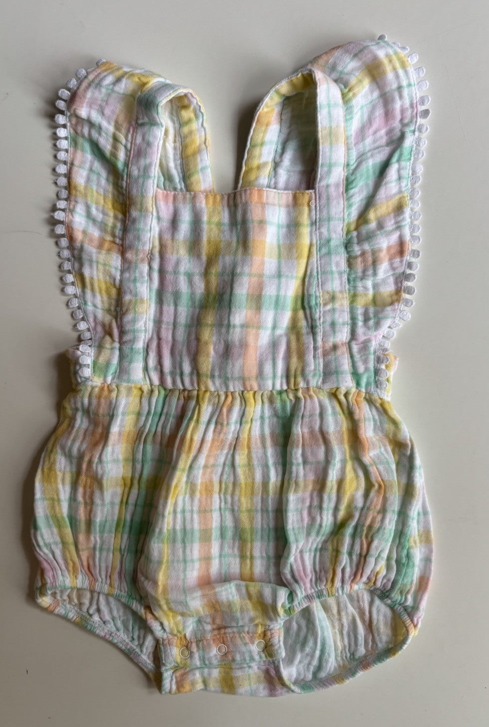 Dymples baby girl size 12-18 months colourful check romper, BNWT