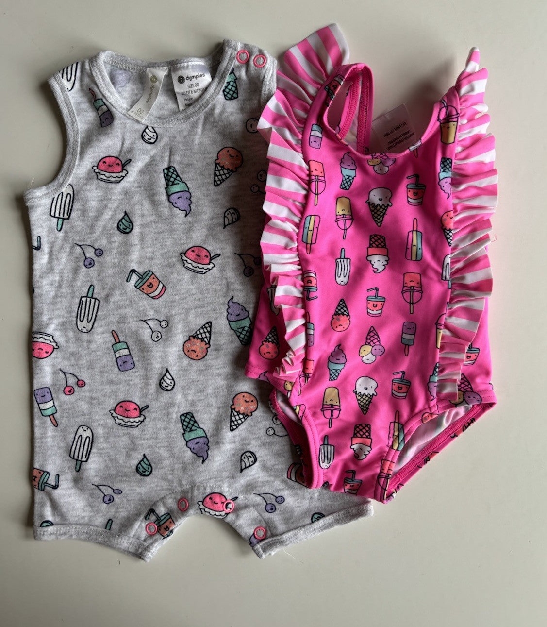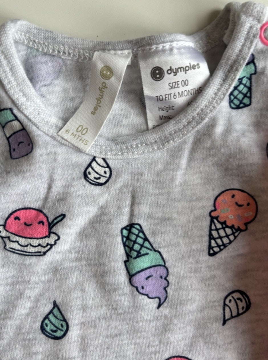 Dymples baby girl size 3-6 months grey pink ice creams romper bathers set, VGUC