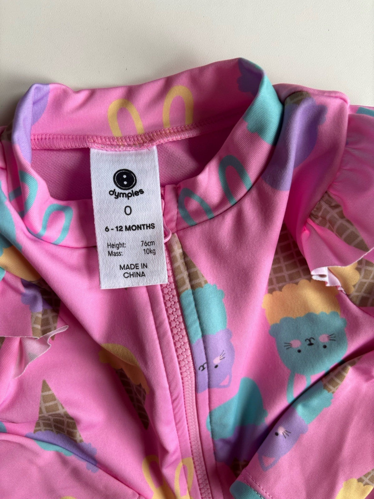 Dymples baby girl size 6-12 months pink ice cream animals bathers swim, VGUC