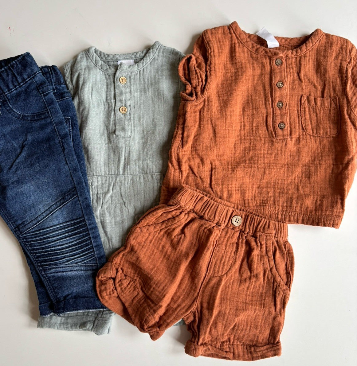 Dymples baby size 3-6 months green brown romper top jeans bundle, VGUC
