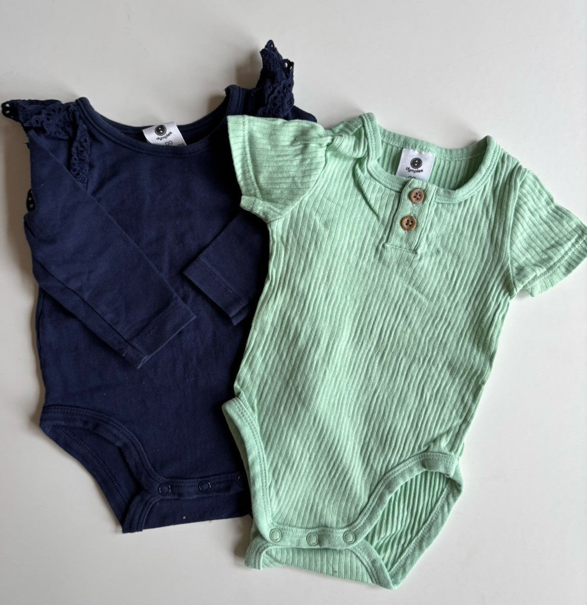 Dymples baby size 3-6 months x2 blue green bodysuit t-shirt bundle, VGUC