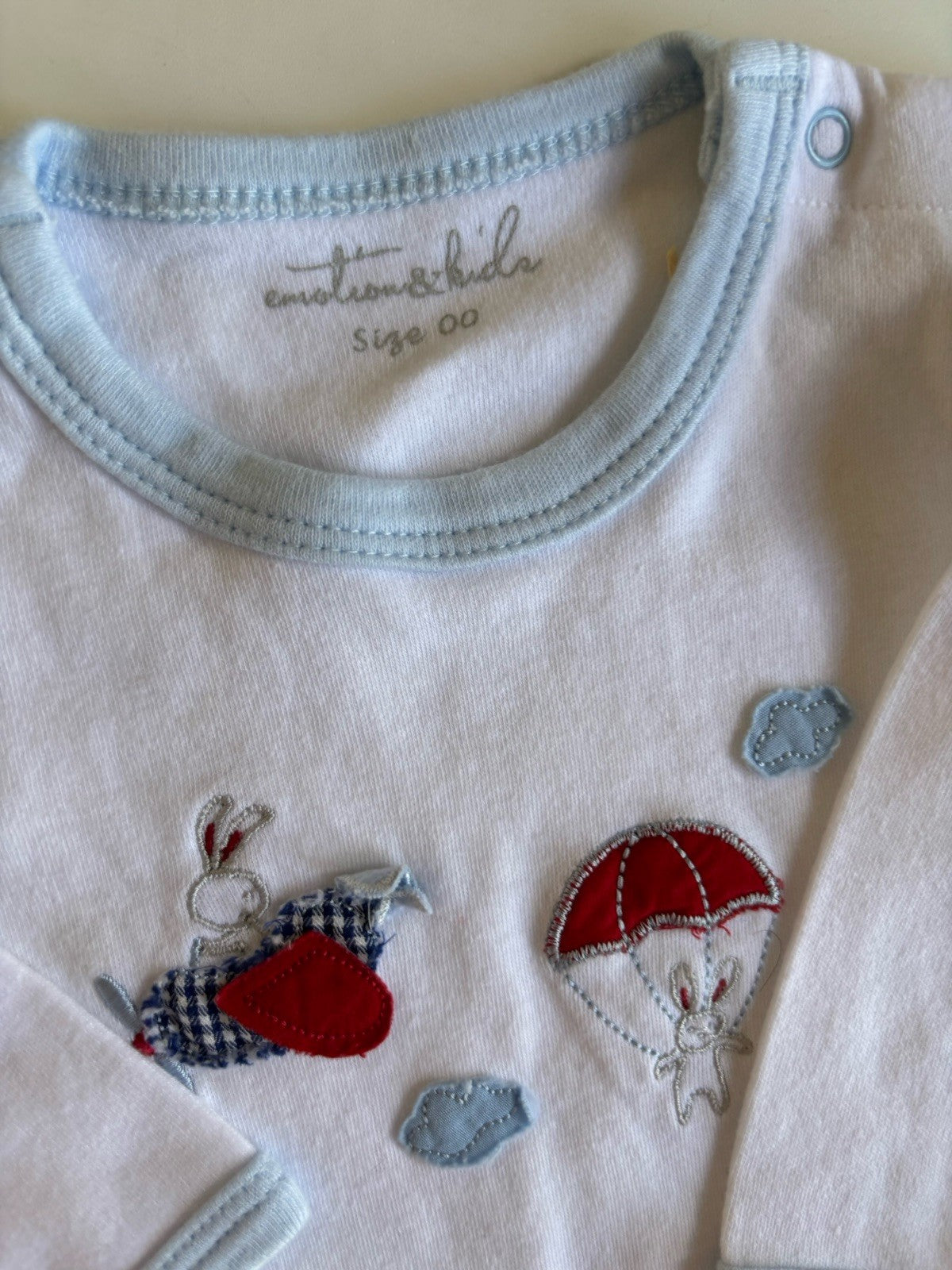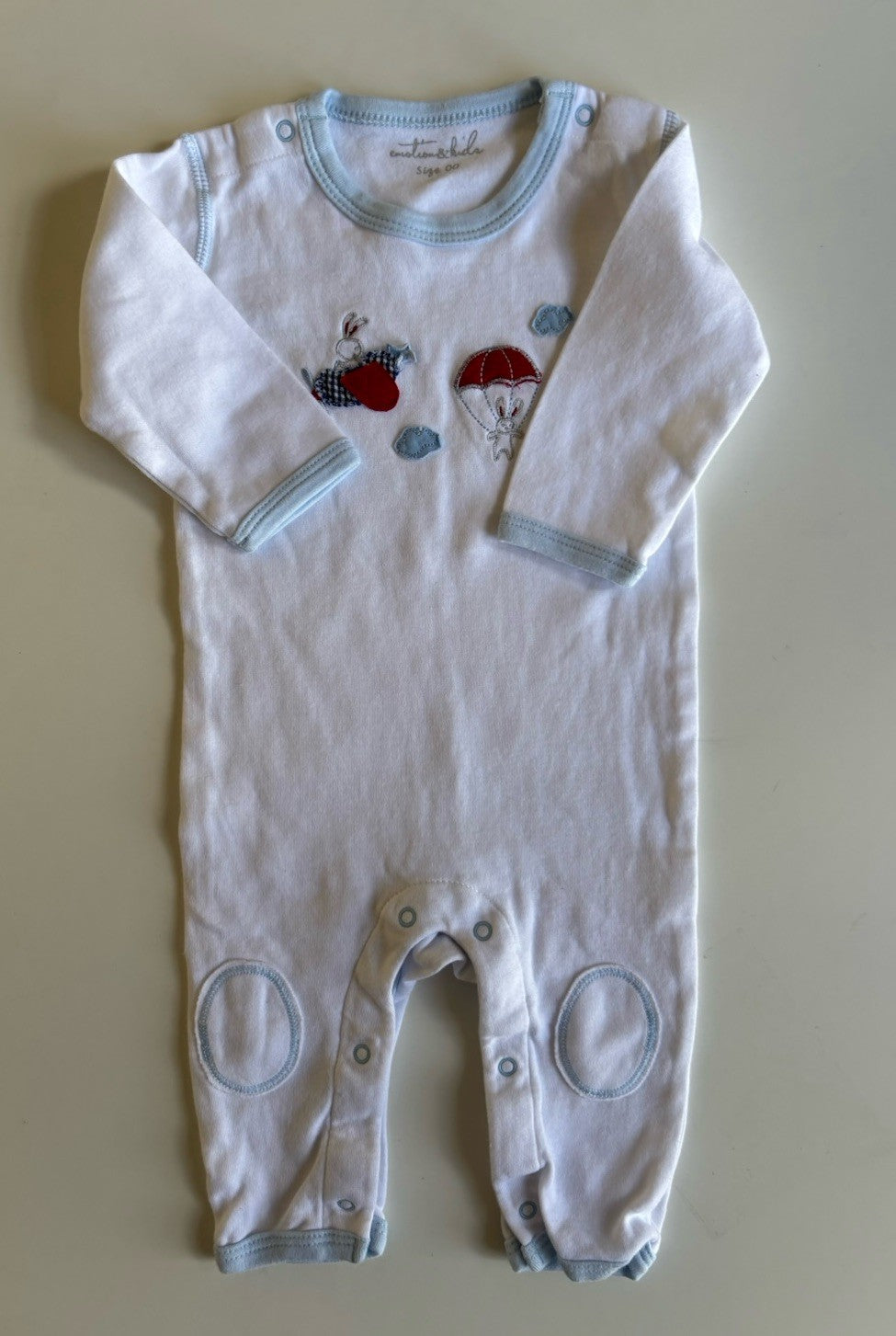 Emotion & Kids size 3-6 months white blue bunny plane one-piece, VGUC