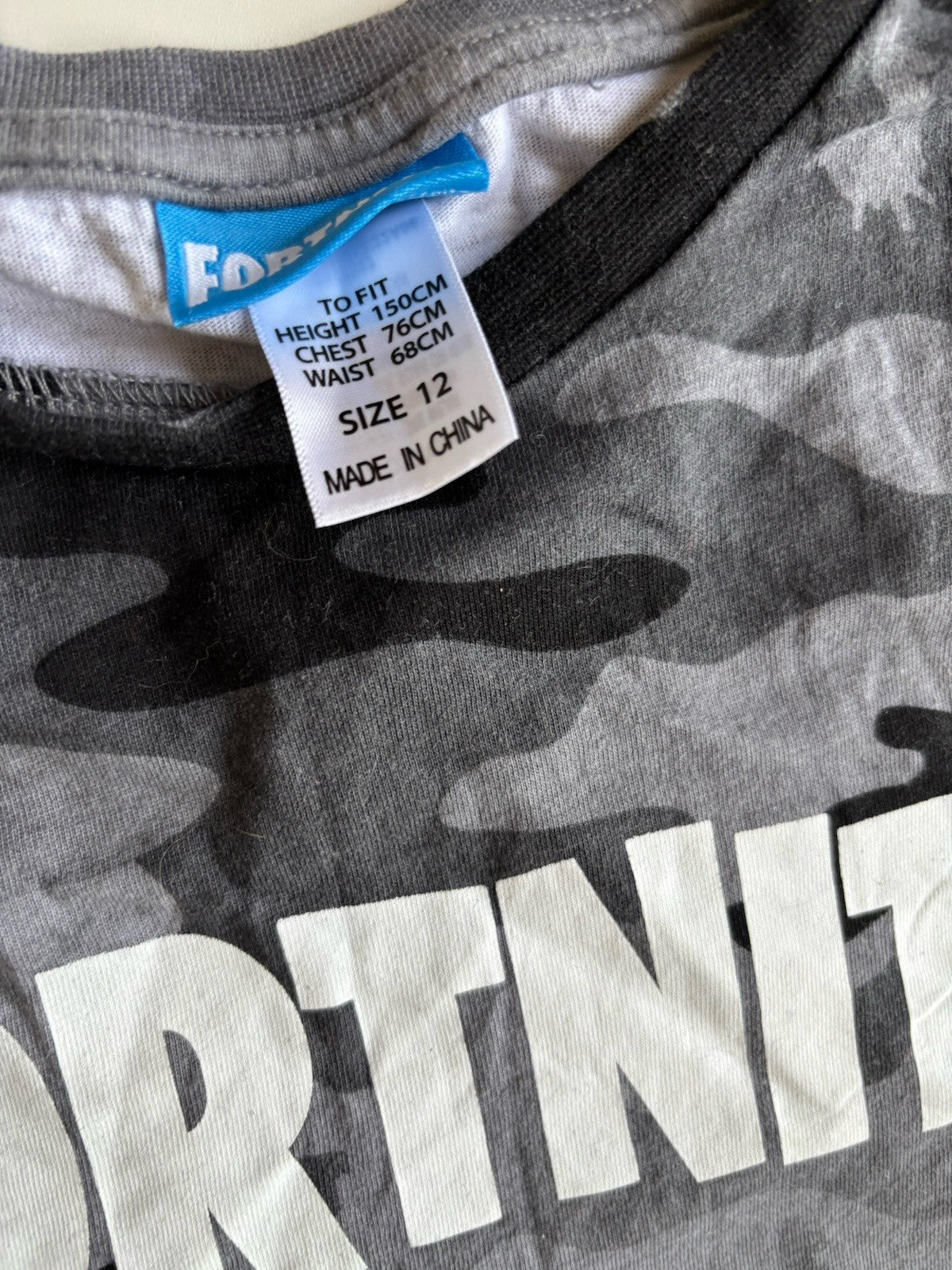 Fortnite kids boys size 12 grey camo short sleeve t-shirt, VGUC