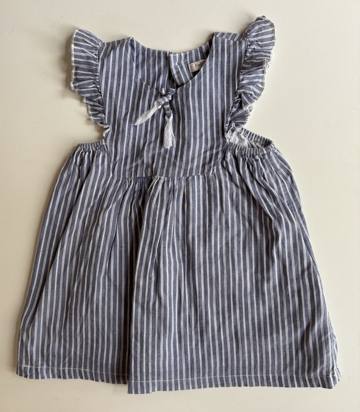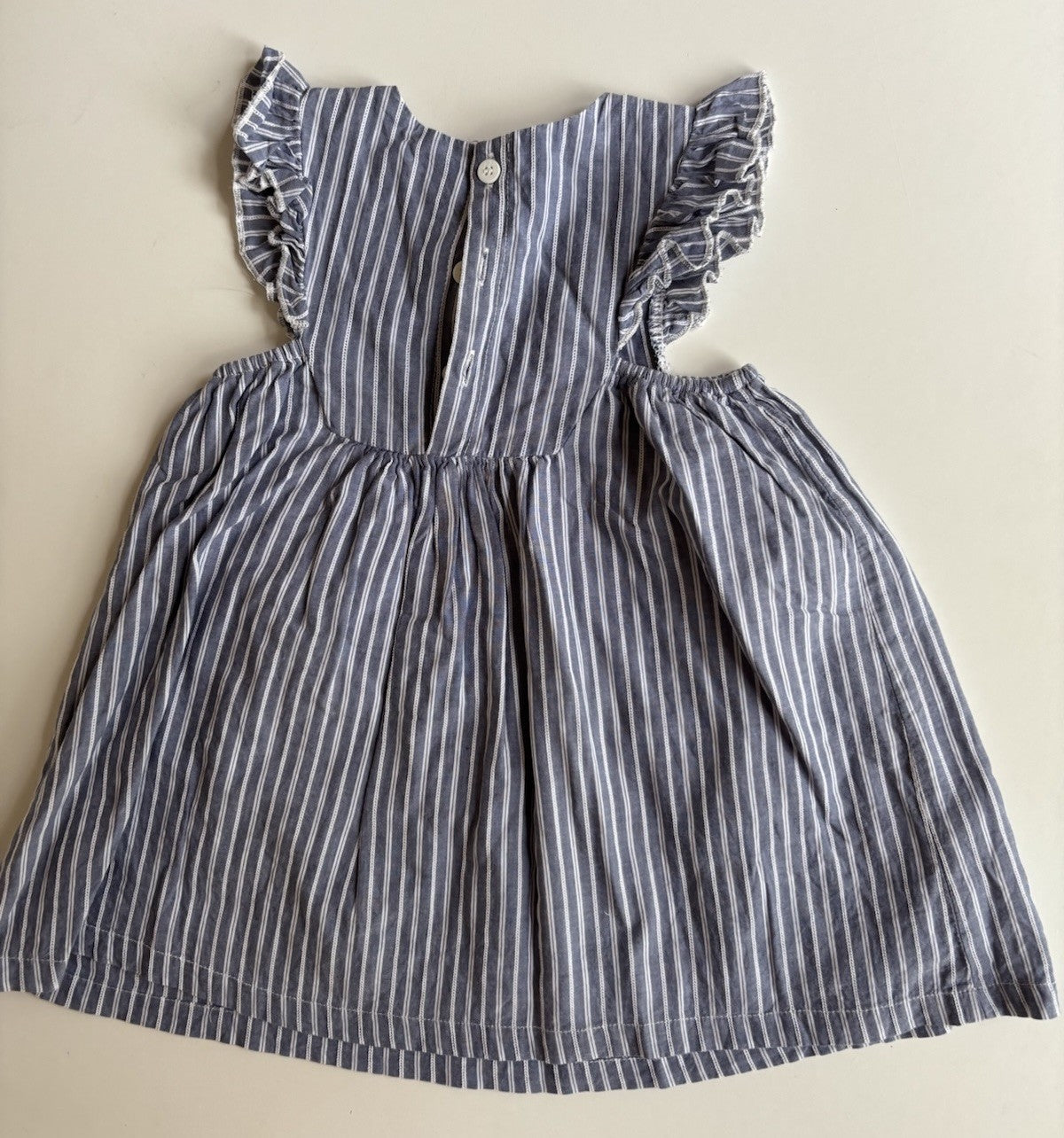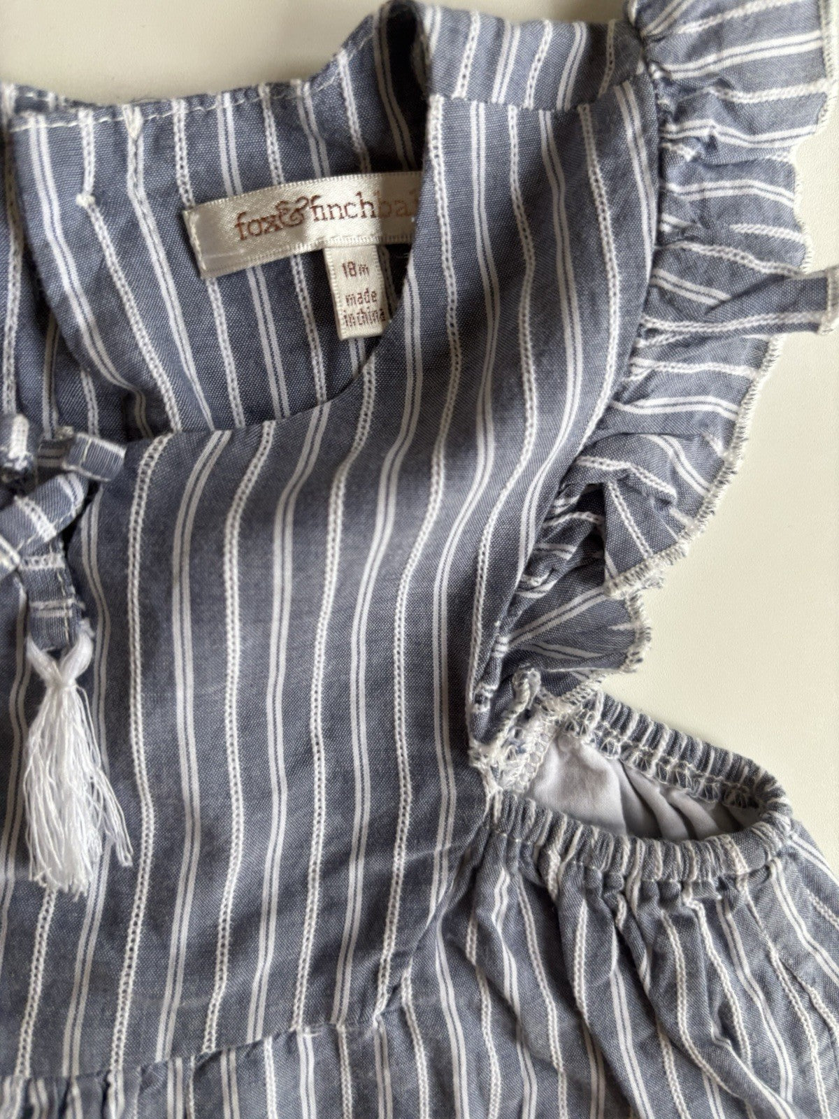 Fox & Finch baby girl size 12-18 months blue grey stripe dress, VGUC