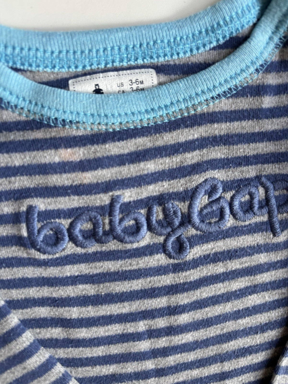 GAP baby size 3-6 months grey blue stripe bodysuit long sleeve, VGUC