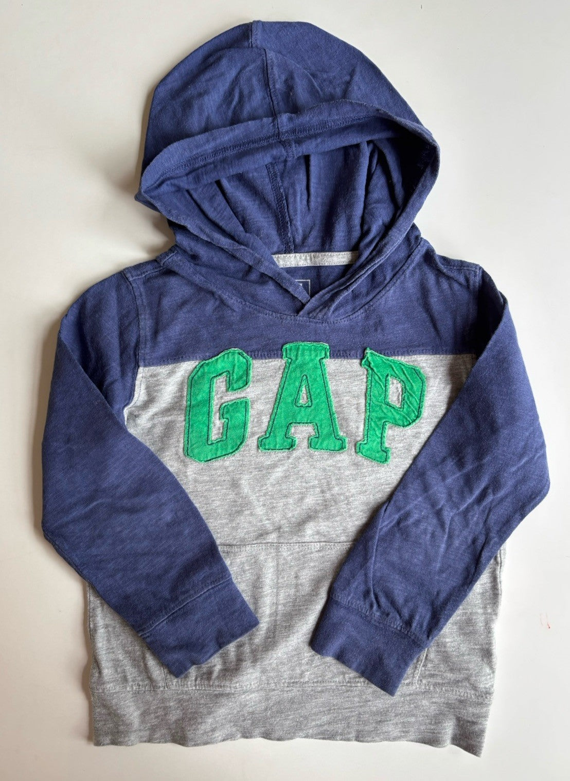 GAP kids boys size 5 years grey blue logo hooded t-shirt, VGUC