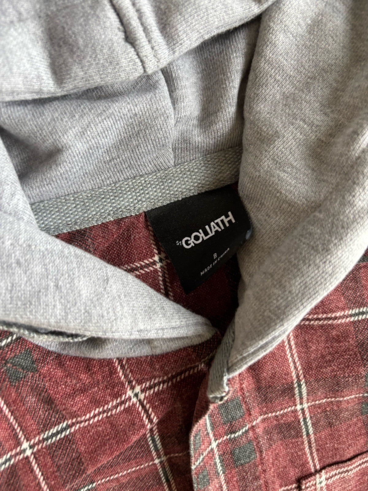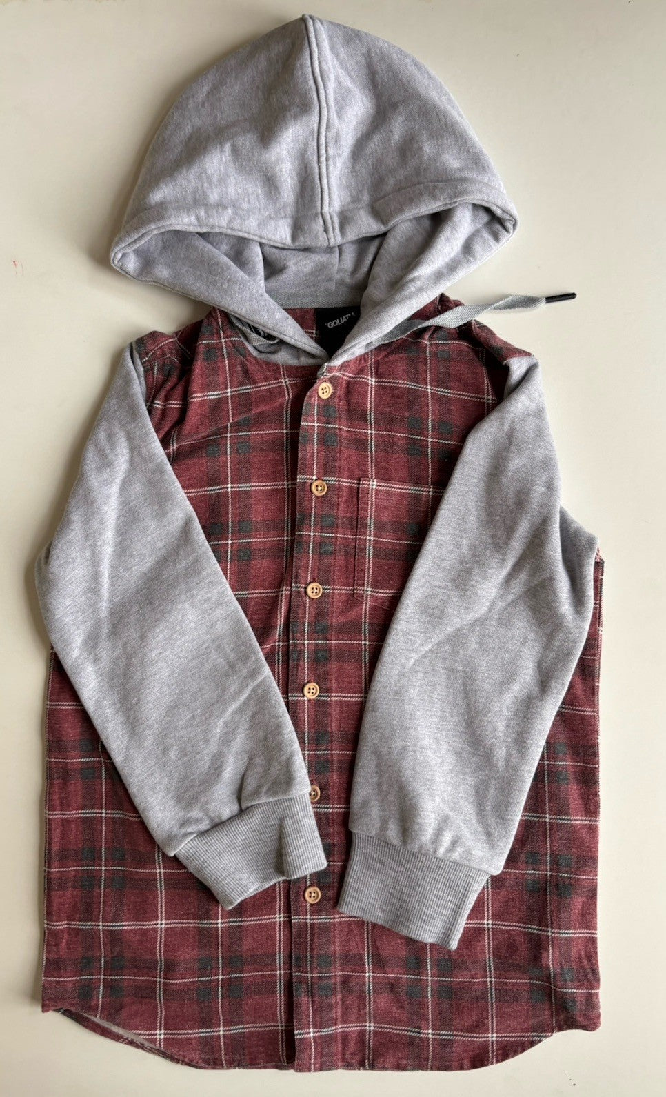 Goliath kids boys size 8 maroon grey button up check shirt hood, VGUC