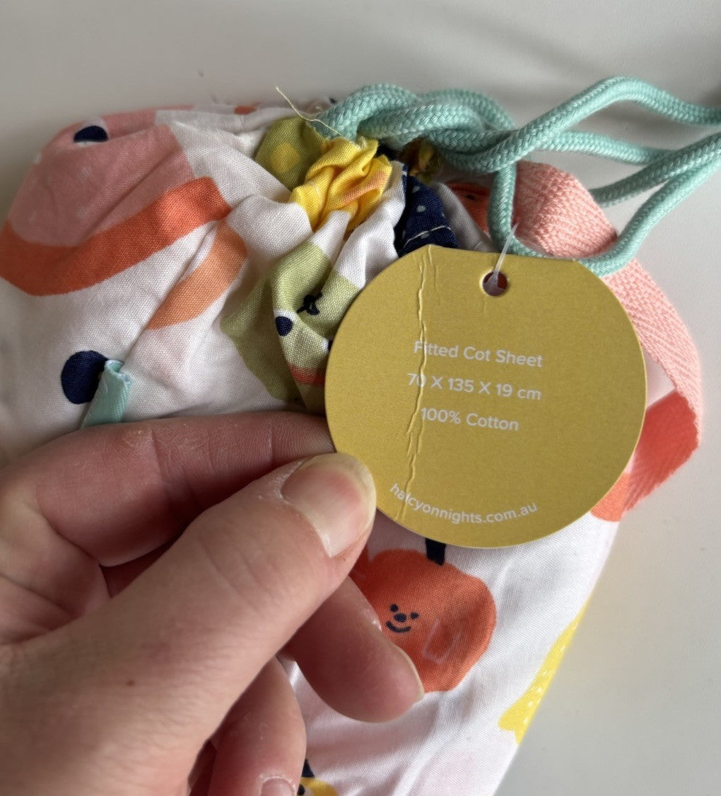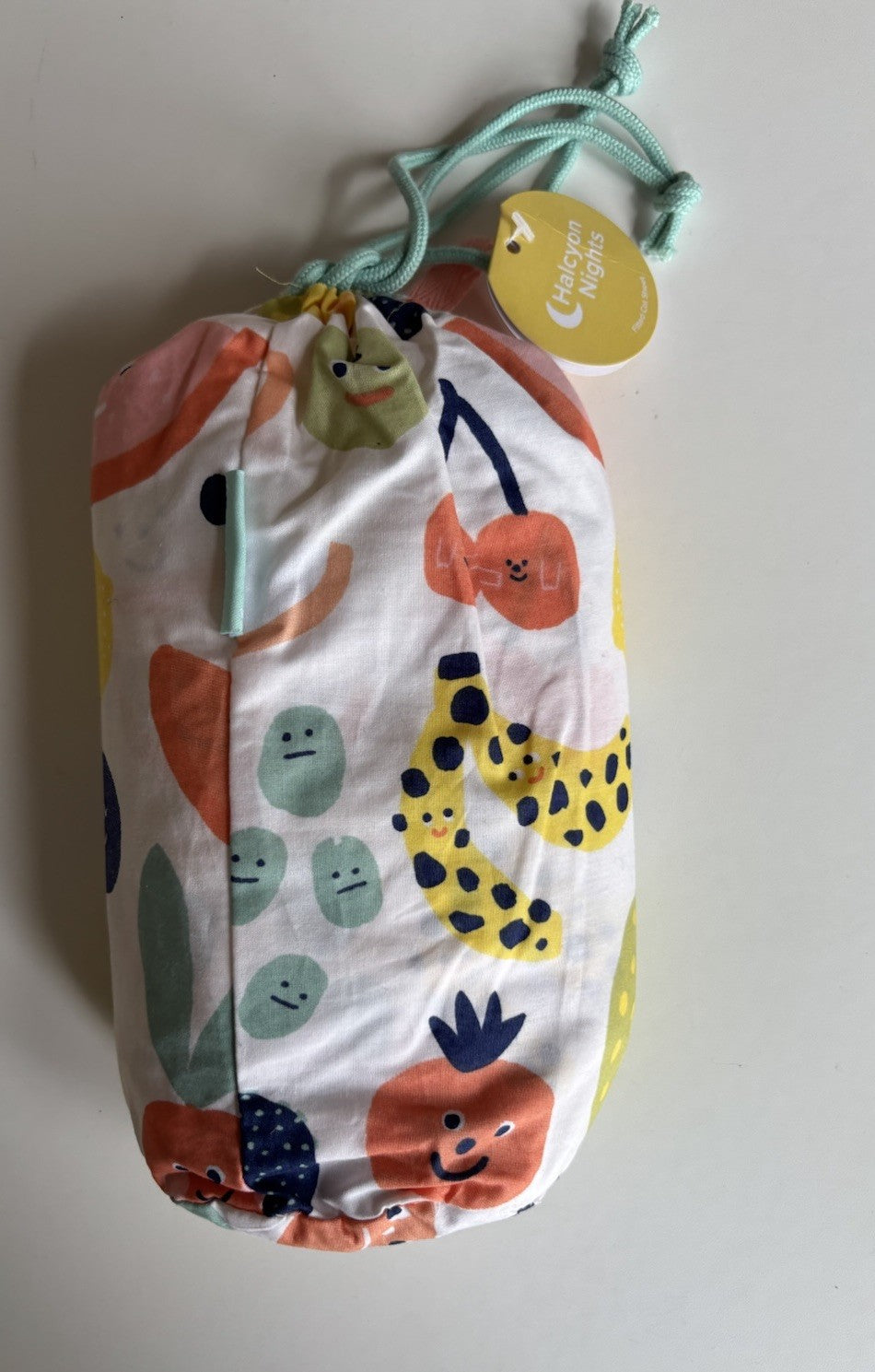 Halcyon Nights baby cot fitted sheet white fruits vegetables, BNWT