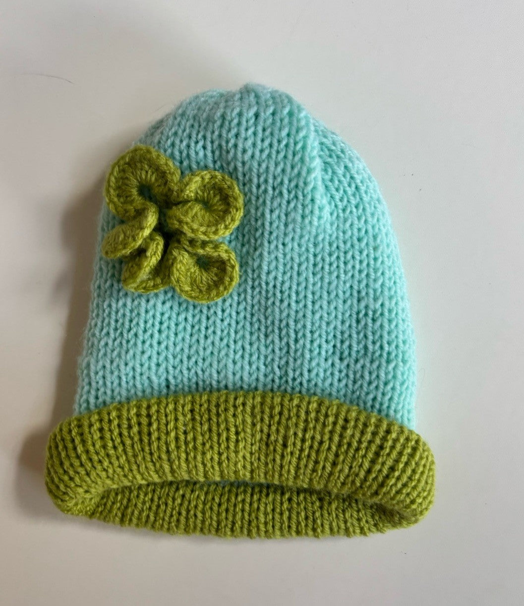 Handmade baby girl size approx. 1-2 years green knitted beanie hat, VGUC