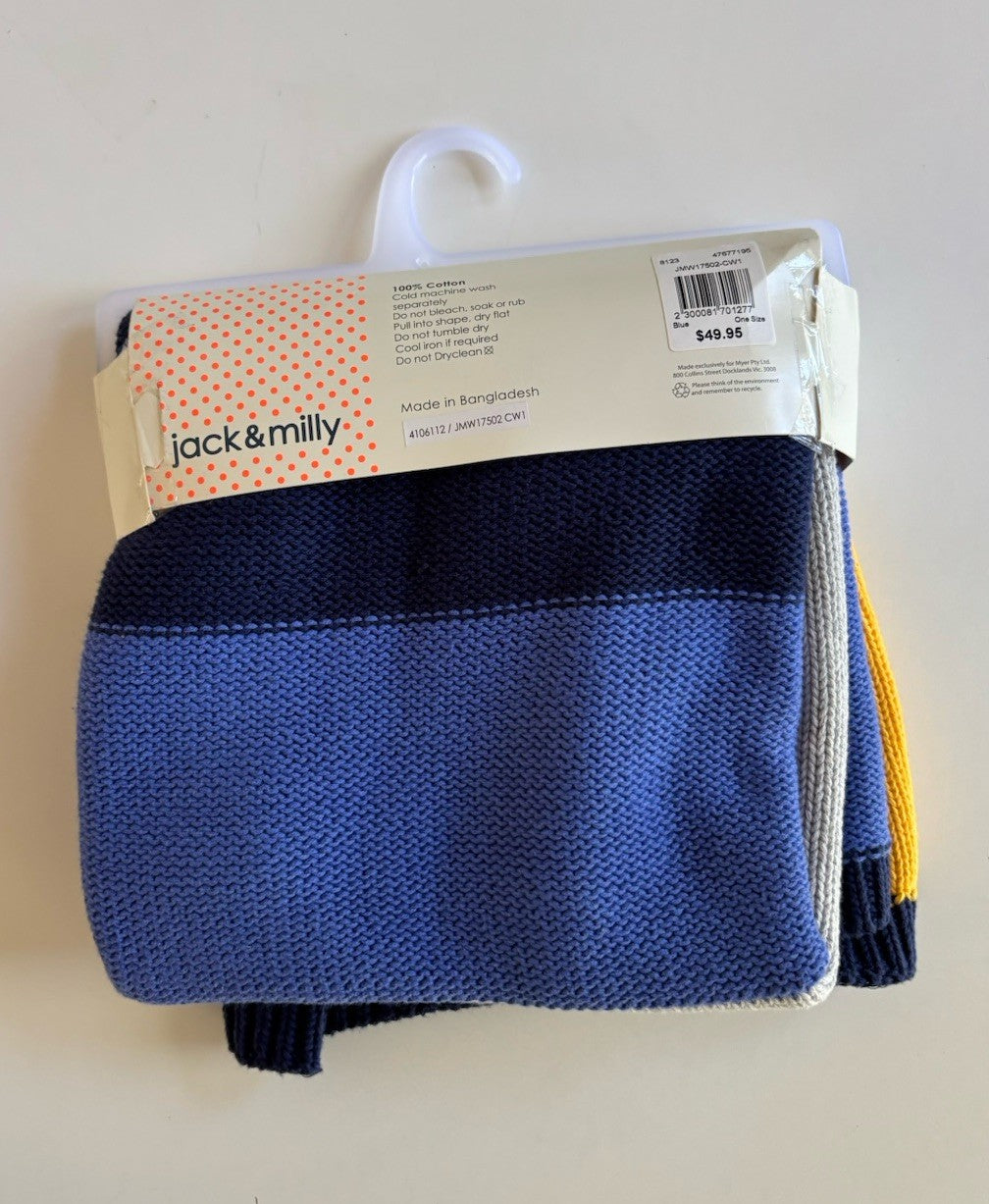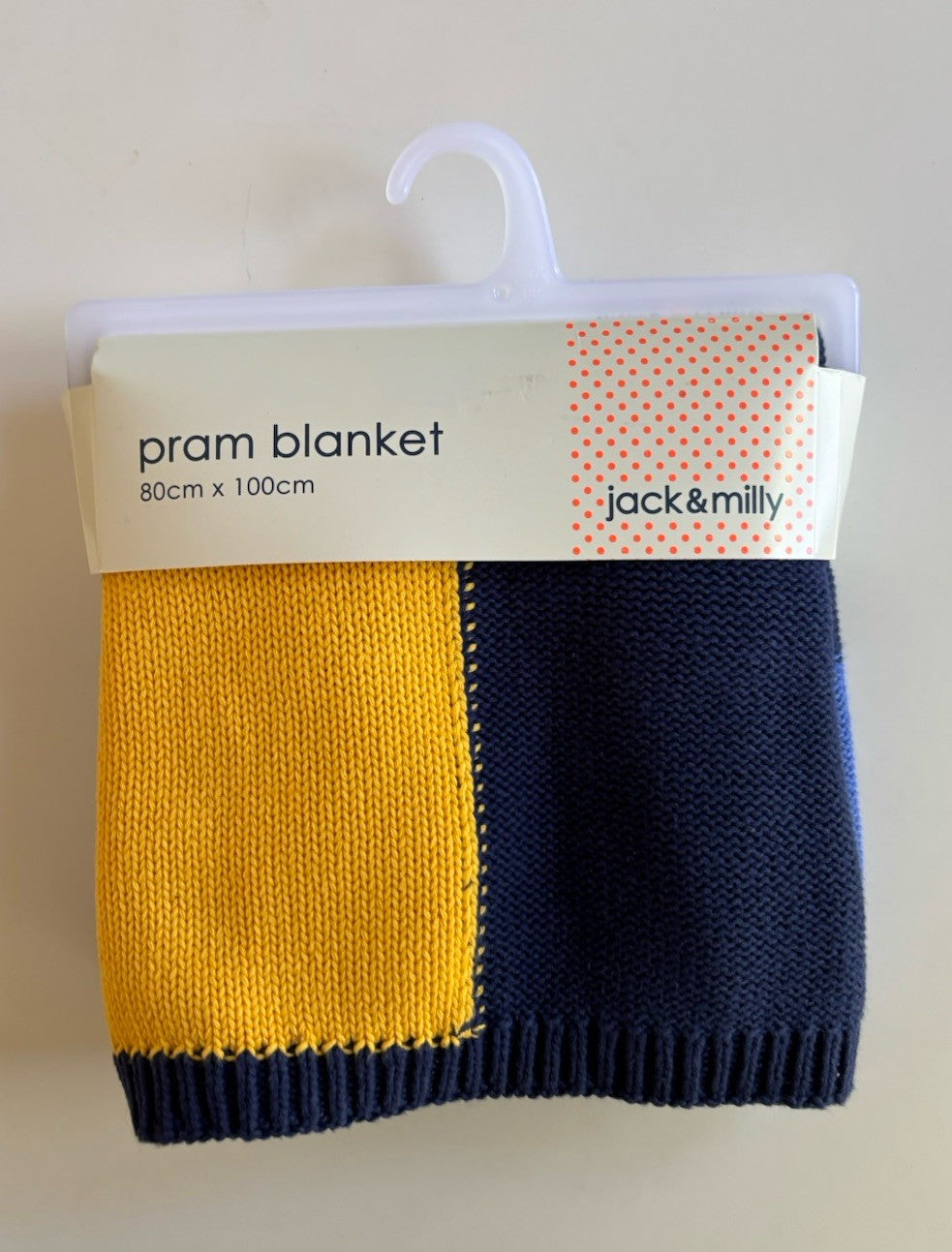 Jack & Milly baby pram blanket knitted yellow blue grey cotton, BNWT