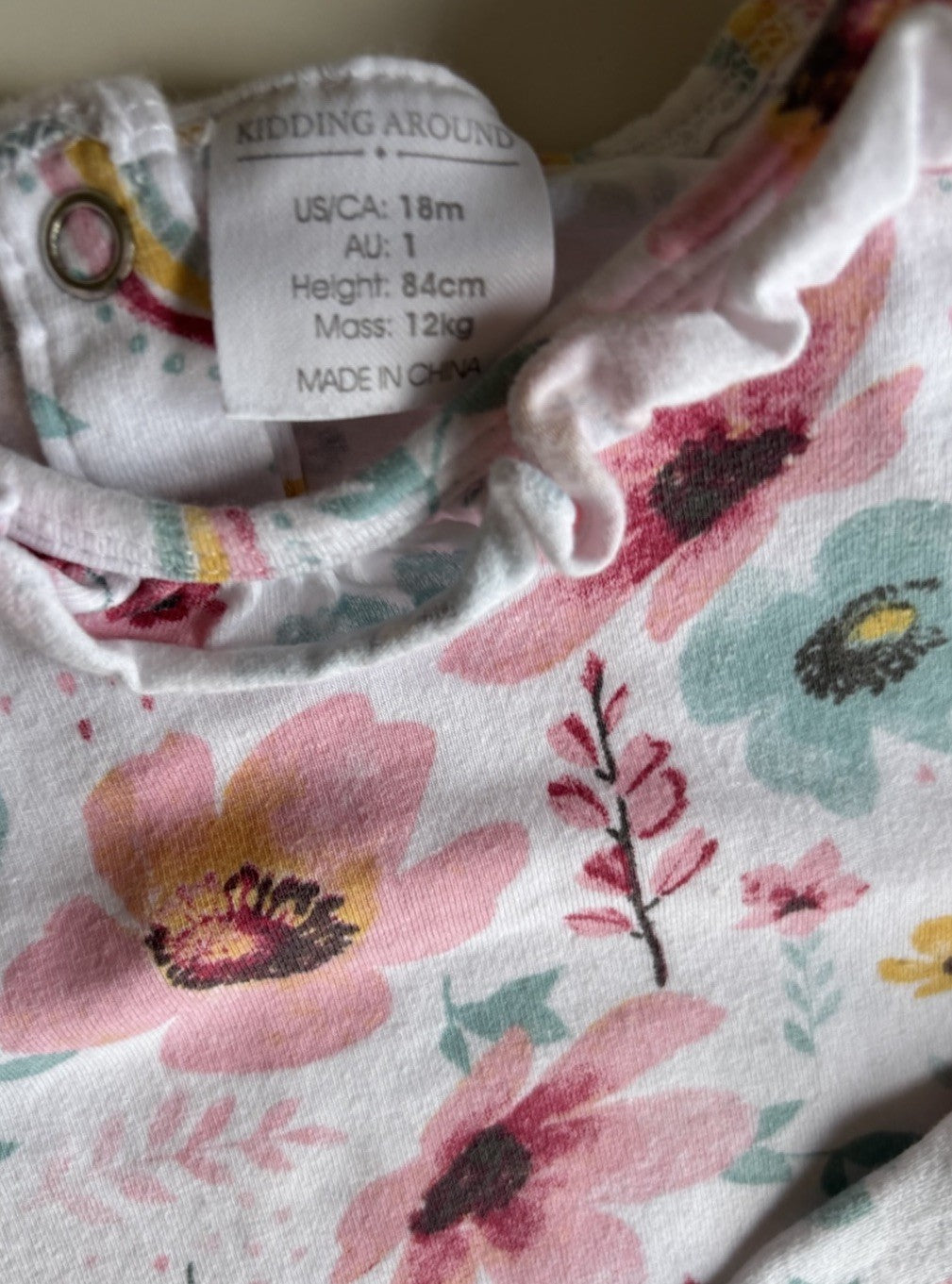 Kidding Around baby girl size 12-18 months pink floral rainbows bodysu