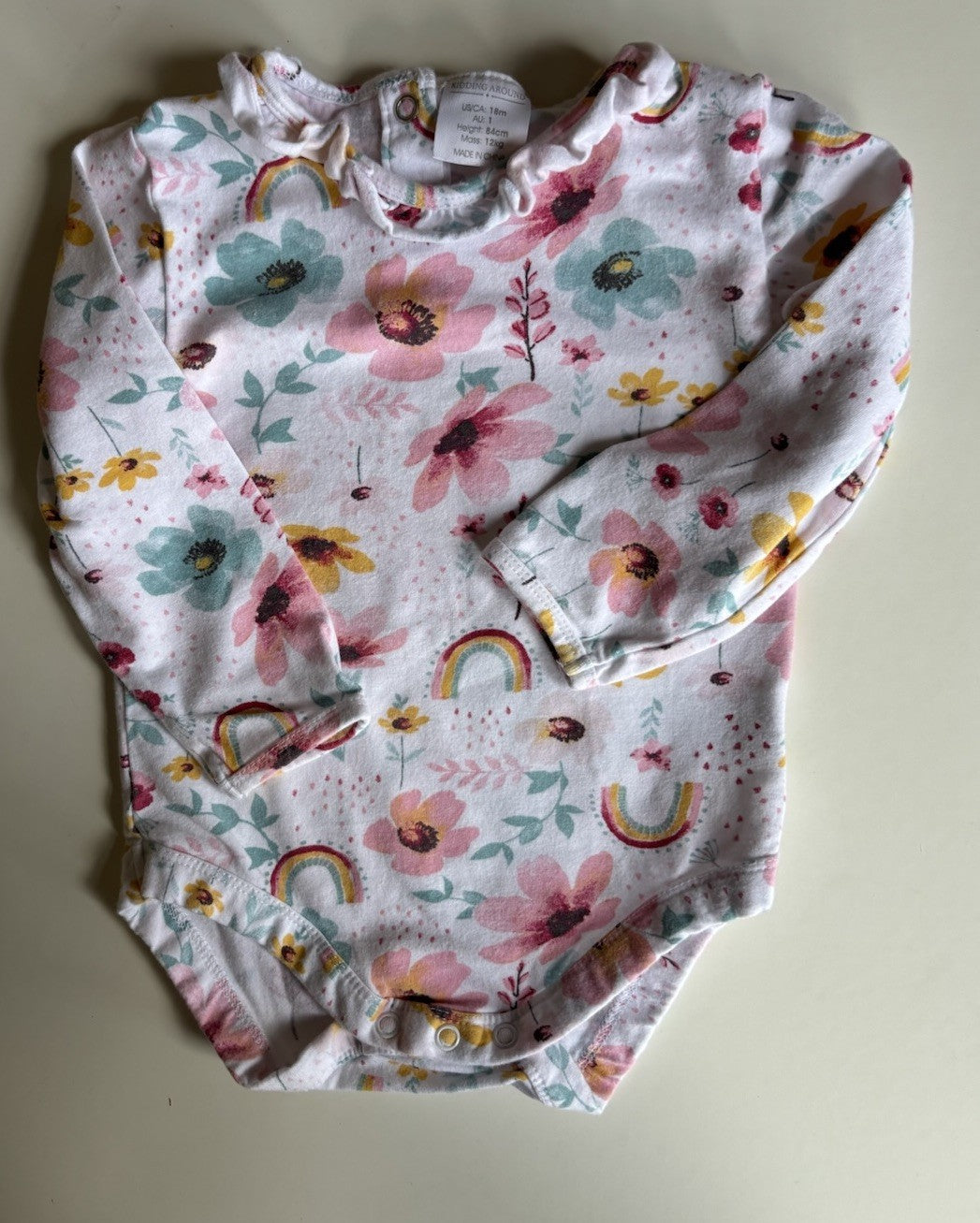 Kidding Around baby girl size 12-18 months pink floral rainbows bodysuit, VGUC
